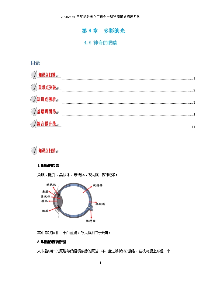 2020-2021学年沪科版八年级全一册物理精讲精练专辑:4.6 神奇的眼睛(原卷版和解析版)