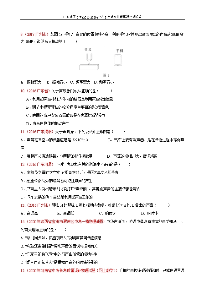 广东地区5年(2016-2020)中考1年模拟物理真题分类汇编:专题01 声现象(原卷版和解析版)