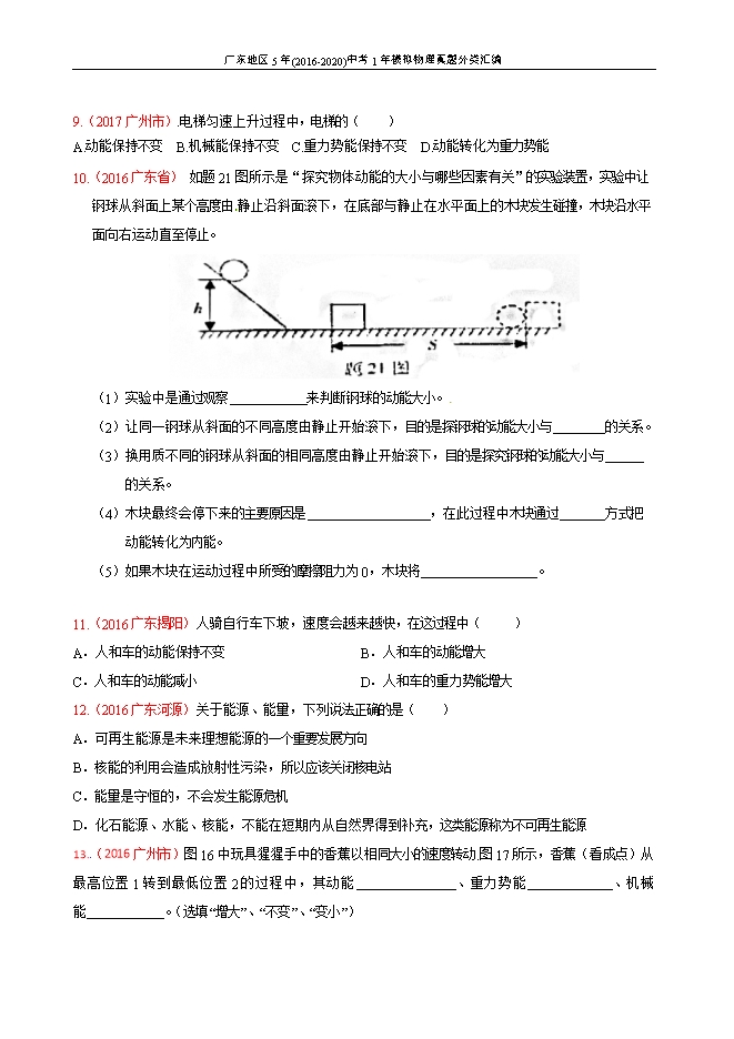 【内容简介】1.(2020广东省).关于如图所示的实验装置,表述错误的是( ) A. 该装置可用来研究电磁感应现象B. 该装置能将电能转化为机械能C. 该装置可用来研究磁场对通电导体的作用D. 该装置揭示的原理可应用于电动机【答案】A【解析】【分析】通电导体在磁场中会受到力的作用,这一现象是电动机的原理;在这一过程中,电能转化为机械能。【详解】A.图中不是电磁感应的研究装置,因此不能研究电磁感应现象,故A错误,符合题意;B.该装置实验过程中使电能转化为机械能,故B正确,不符合题意;C.图中的装置可以研究磁场对通电导体的作用力,故C正确,不符合题意;D.通电导体在磁场中受力是电动机的原理,故D正确,不符合题意。故选A。2.(2019广东省).如图所示,用细线系住小球悬挂在O点,将小球拉至A点释放,从A点经过B点运动到C点的过程中,小球的重力势能先变小后_______,动能先________后________。(选填“变大”、“变小”或“不变”) 【答案】 (1). 变大 (2). 变大 (3). 变小【解析】【详解】由于重力势能的大小跟物体所处的高度有关,即物体所处的高度越高,其重力势能越大,反之则越小,所以小球从A点运动到B点再到C点的过程,其高度先变小再变大,故其重力势能先变小后变大;物体的动能跟其速度有关,即速度越大,动能越大,反之则越小;在小球由A点运动到B点时,其速度在变大,而由B点运动到C点时,其速度在变小,故小球的动能变化是先变大后变小。3.(2019深圳市)如图,弧形轨道ab段光滑,bc段粗糙,小球从a点经最低点b运动至c点.下列分析正确的是() A. 从a到b的过程中,小球动能转化为重力势能B. 经过b点时,小球动能最大C. 从b到c的过程中,小球动能增大D. 从a到c的过程中,小球机械能守恒【答案】B【解析】【详解】A.从a到b的过程中,小球高度降低,重力势能转化为动能,故A错误;B.小球从a运动到b动能增大;从b运动到c动能减小,则在b点处小球动能最大,故B正确;C.小球从b到c的过程中,高度增加,同时克服摩擦力做功,速度减小,则小球的动能减小,故C错误;D.bc段弧形轨道粗糙,因此小球在bc段运动时会克服摩擦力做功,会有一部分机械能转化为内能,则机械能会减小,故D错误.4.(2019广州市)如图所示的摆设,正常运行时,小轮在支架上来回摆动,每次到达的最大高度相同,小明发现摆设上有一电源,关掉电源后,小轮逐新停下来 A. 小轮滚动过程中没有力对其做功B. 正常运行时,小轮的速度一直不变C. 断电后小轮会停下,说明能量守定律不一定成立D. 正常运行时,小轮往返一次,摆设一定需要消耗电能【答案】D【解析】【详解】A.小轮在滚动过程需要克服摩擦力做功,故A错误;B.正常运行时,小轮存在重力势能与动能之间的转化,所以其速度是不断变化的,故B错误;C.断电后小轮会停下,说明小轮的机械能转化成其它形式的能,在转化过程总的能量保持不变,所以能量守恒定律一定是成立的,故C错误;D.小轮在往返过程需要克服摩擦力做功,从而使机械能减少,但为了使小轮每次到达的最大高度相同,就要使小轮的机械能保持不变,则需要提供另外一种能量来补偿减少的机械能,而这个另外的能量正是由电源提供的,因此小轮往返一次,摆设一定需要消耗电能,故D正确.5.(2018广东省)(3)长征七号火箭所搭载的“天舟一号”货运飞船在上升过程中的机械能不断_______(选填“变大”、“变小”或“不变”),长征七号火箭燃料的________能燃烧时转化为内能.【答案】 (3). 变大 化学【解析】(3)“天舟一号”货运飞船在上升过程中,质量不变,高度增加,速度增大,所以重力势能和动能都增大,即机械能不断变大;长征七号火箭燃料燃烧,释放内能,温度升高,内能增大,所以能量的转化过程是燃料的化学能转化为内能.6.(2018深圳市)三峡工程是一项伟大的工程,主要由大坝、电站厂房和通航建筑物三部分组成.三峡大坝上窄下宽.蓄水位高达175m,水从高处落下,冲击涡轮进行发电,年平均发电量880亿千瓦时,三峡大坝正常蓄水后,上下游水位落差达113m,为方便船只在上、下游之间往返,三峡船闸设有5个闸室.三峡大坝蓄水后,水域面积扩大使附近地区昼夜温差缩小,改变了库区的气候环境.请在上面的材料中找出与物理相关的描述,并说明所涉及的物理知识,填写下表.(不能与示例相同,物理知识不能重复.) 【答案】水从高处落下|重力势能转化为动能|冲击涡轮进行发电|水的机械能转化为电能【解析】分析:根据所学的物理知识进行分析三峡工程,可以从以下几方面考虑:运动状态的问题、液体压强,动能和势能的变化问题等等,涉及不同的知识点,问题不同,答案也不同.解答:(1)水从高处落下,重力势能变小,动能变大,重力势能转化为动能;(2)水从高处落下冲击涡轮进行发电是把水的机械能转化为电能进行发电;(3)方便船只在上、下游之间往返,三峡船闸设有5个闸室.利用了连通器原理等;故答案为水从高处落下|重力势能转化为动能|冲击涡轮进行发电|水的机械能转化为电能【点睛】本题是一道开放性题,解答时要根据相关情景,归纳出相关的知识,然后将现象与相关的知识联系起来.