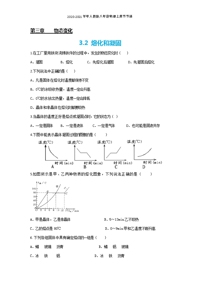 【内容简介】1.在工厂里用铁块浇铸铁件的过程中,发生的物态变化时( )A.凝固 B.熔化 C.先熔化后凝固 D.先凝固后熔化【答案】C【解析】铁块浇铸铁件,先要把铁块熔化为铁水,然后再将铁水注入模具,铸成铁件,所以发生的物态变化是先熔化后凝固,选C。2.下列说法中正确的是( )A.凡是固体在熔化时温度都保持不变B.0℃的冰吸收热量,温度一定会升高C.0℃的水放出热量,温度一定会降低D.晶体和非晶体在熔化时都要吸热【答案】D【解析】A.固体分为晶体和非晶体,非晶体在熔化时温度要不断上升,晶体在熔化时温度保持不变,A错。B.0℃的冰吸收热量后,冰会熔化为水,形成冰水混合物,保持温度不变,直到全部熔化变成水后,水吸热再升温,B错。C.0℃的水放出热量,水会凝固成冰,形成冰水混合物,保持温度不变,直到全部凝固变成冰后,冰放热再降温,C错。D.固体熔化时是一个吸热过程,所以晶体和非晶体在熔化时都要吸热,D正确。选D。3.当晶体的温度正好是熔点或凝固点时,它的状态为( )A.一定是固体 B.一定是液体 C.一定是气体 D.也可能是固液共存【答案】D【解析】当晶体的温度正好是熔点或凝固点时,它的状态可能为固体、液体、固液共存,D正确。选D。4.下图中能表示晶体凝固过程的图像的是( ) 【答案】B【解析】A表示非晶体的凝固过程图像;B表示晶体的凝固过程图像;C表示晶体的熔化过程的图像;D表示非晶体的熔化过程图像。选B。5.如图所示是甲、乙两种物质的熔化图象,下列说法正确的是( ) A.甲是晶体,乙是非晶体 B.5~13min乙不吸热C.乙的熔点是80℃ D.0~9min甲和乙温度不断升高【答案】C【解析】A.由图可知:甲在熔化时,温度不断上升,是非晶体,A错。B.5~13min乙处于熔化过程,虽然温度不变,但要吸收热量,B错。C.由图像可以看出:乙在80℃时,只吸热,不升温,所以它是晶体,此温度为熔点,C正确。D.0~9min甲温度不断升高,乙在0—5min吸热升温,5—9min温度不变,D错。选C。6.下列各组固体中具有确定熔点的一组是( )A.蜡 玻璃 沥青 B.蜡 铝 玻璃 C.冰 铁 铝 D.冰 铁 沥青【答案】C【解析】A.蜡、玻璃、沥青都是非晶体,都没有固定的熔点,A错。B.蜡和玻璃是非晶体,没有确定的熔点,铝是晶体,有熔点,B错。C.冰、铁、铝都是晶体,都有固定的熔点,C正确。D.沥青是非晶体,没有固定的熔点,冰和铁是晶体,有固定的熔点,D错。选C。