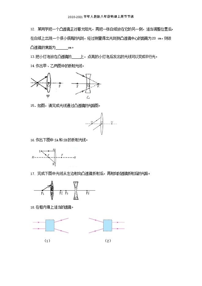 【内容简介】1.下图中,不是凸透镜的是( )A B C D【答案】B【解析】凸透镜是中间厚,边缘薄的一种透镜。B中的透镜,中间薄,边缘厚,是凹透镜。选B。2.下列作图中不正确的是( ) 【答案】C【解析】A.平行于凸透镜主光轴的光线,通过凸透镜后交于凸透镜的焦点。A正确。BC. 平行于凹透镜主光轴的光线,通过凹透镜后,折射光线的反向延长线交于焦点。B正确,C错。D.从凸透镜焦点处发出的光线,经过凸透镜后,平行于凸透镜的主光轴,D正确。选C。3.下列说法正确的是( )A.凸透镜可以对光线起发散作用B.凸透镜只对平行于主轴的光线起会聚作用C.通过凸透镜后的光线是发散的,因此凸透镜的作用是对光线起发散作用D.通过凸透镜后的光线发散程度比原来小,仍然是会聚的一种表现【答案】D【解析】A.凸透镜可以对光线起会聚作用,A错。B.凸透镜所有光线都有会聚作用,B错。C.通过凸透镜后的光线是会聚的,因此凸透镜的作用是对光线起会聚作用,C错。D.通过凸透镜后的光线发散程度比原来小,是会聚的一种表现。凸透镜对光线的会聚作用不仅仅是将平行于主光轴的光线会聚于焦点,还能使发散的光线,发散程度减小。D正确,选D。4. 张凤利用太阳光测量凸透镜的焦距。他让凸透镜正对阳光,但没有仔细调节纸片与透镜的距离,在纸片上的光斑并不是最小时,就测出了光斑到凸透镜中心的距离f,那么,凸透镜的实际焦距( )A.一定小于f B.一定大于fC.可能等于f D.可能小于f,也可能大于f【答案】D【解析】在纸片上的光斑并不是最小时,就测出了光斑到凸透镜中心的距离f,这个距离既有可能是在焦点内的距离,这时小于焦距f,也有可能是焦点外的距离,这时大于焦距f,所以既可能小于f,也可能大于f,选D。5. 下列能使光线会聚的镜是( )A.平面镜 B.凹透镜 C.凸透镜 D.凸面镜【答案】C【解析】A.平面镜,只能改变光的传播方向,不能使光线会聚或发散,A错。B.凹透镜,对光线起发散作用,B错。C.凸透镜,对光线起会聚作用,C正确。D.凸面镜,对光线起发散作用,D错。选C。6. 下列关于透镜的说法错误的是( )A.凸透镜是中间厚、边缘薄的透镜B.凹透镜可以将平行光发散C.凸透镜可以将平行光会聚于一点D.凸透镜摔成两半,其中任何一块都会失去会聚作用【答案】D【解析】A.凸透镜的特点就是中间厚、边缘薄,A正确。B.凹透镜可以将平行于主光轴的光线发散,使其不再平行、相交,对相交的光线,延后相交,B正确。C.凸透镜可以将平行于它主光轴的光线会聚于焦点,C正确。D.凸透镜摔成两半,其中任何一块依然保持了凸透镜的结构特点,任然有会聚作用。D错,选D。