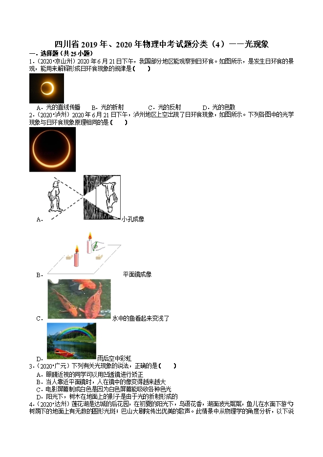 【内容简介】1.(2020•凉山州)2020年6月21日下午,我国部分地区能观察到日环食。如图所示,是发生日环食的景观,能用来解释形成日环食现象的规律是 A.光的直线传播B.光的折射C.光的反射D.光的色散2.(2020•泸州)2020年6月21日下午,泸州地区上空出现了日环食现象,如图所示。下列各图中的光学现象与日环食现象原理相同的是 A. 小孔成像B. 平面镜成像C. 水中的鱼看起来变浅了D. 雨后空中彩虹3.(2020•广元)下列有关光现象的说法,正确的是 A.眼睛近视的同学可以用凹透镜进行矫正B.当人靠近平面镜时,人在镜中的像变得越来越大C.电影屏幕制成白色是因为白色屏幕能吸收各种色光D.阳光下,树木在地面上的影子是由于光的折射形成的4.(2020•达州)莲花湖是达城的后花园,在初夏的阳光下,鸟语花香,湖面波光粼粼,鱼儿在水面下游弋;树荫下的地面上有无数的圆形光斑;巴山大剧院传出优美的歌声。此情景中从物理学的角度分析,以下说法正确的是 A.树荫下地面上的圆形光斑,是光的直线传播形成的B.我们看见水面下的鱼儿,是鱼儿的实像C.湖面波光粼粼,是太阳光照在水面上发生漫反射形成的D.排练中的小花正在靠近剧院中的大镜子,她在镜中的像逐渐变大5.(2020•乐山)下列光现象中,由光的直线传播形成的是 A. 电视塔在水中的倒影B. 演员对着镜子画脸谱C. 水中的筷子发生“折断”D. 日偏食的形成6.(2020•雅安)生活中处处有物理知识,下列说法中正确的是 A.防疫中最普遍采用的方法是测人体体温,“体温枪”是利用紫外线测体温B.雷电天气总是先看到闪电后听到雷声,是因为在空气中光速大于声速C.体操运动员上器械前在手上涂防滑粉,是为了减小手与器械之间的摩擦力D.在火车站,人必须站在站台安全线外的区域候车,是因为流体流速大的地方压强大7.(2020•自贡)2020年6月21日下午,我国许多地方都出现了日环食,自贡城区也观看到了日偏食的奇观。日环食和日偏食现象形成的原因是 A.光的直线传播B.光的反射C.光的折射D.光的色散8.(2020•成都)人工智能飞速发展的今天,智能配送机器人已被广泛使用,用户可通过人脸识别、输入(扫描)取货码等多种方式取货。如图是某款机器人正在送货的情景,下列分析正确的是