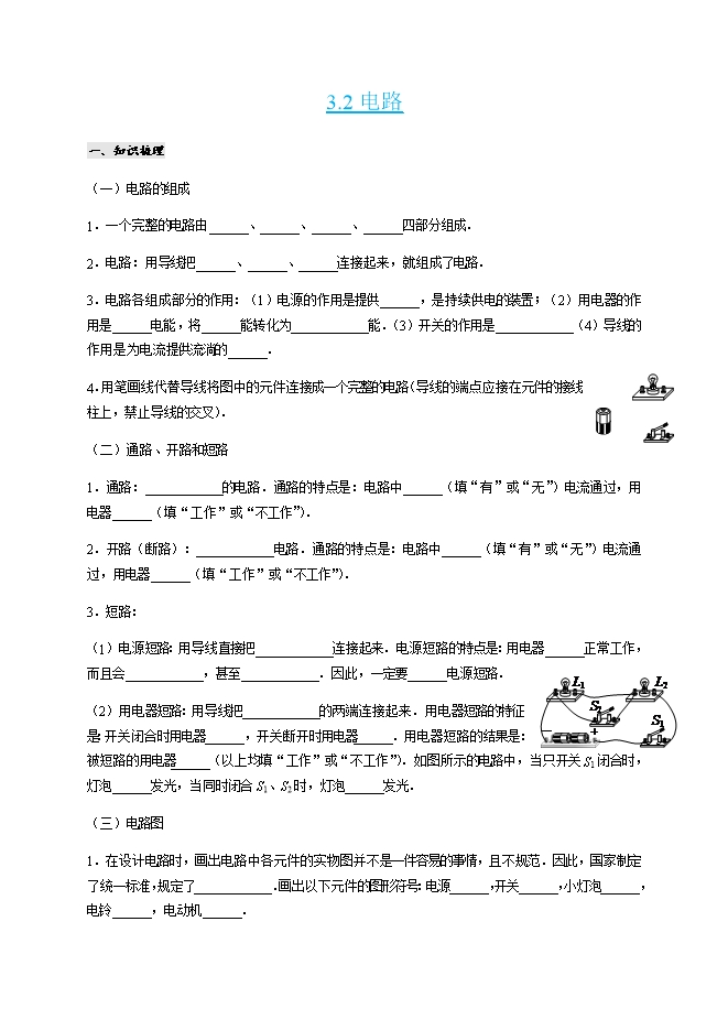 【内容简介】(一)电路的组成1.一个完整的电路由______、______、______、______四部分组成.2.电路:用导线把______、______、______连接起来,就组成了电路.3.电路各组成部分的作用:(1)电源的作用是提供______,是持续供电的装置;(2)用电器的作用是______电能,将______能转化为____________能.(3)开关的作用是____________(4)导线的作用是为电流提供流淌的______.4.用笔画线代替导线将图中的元件连接成一个完整的电路(导线的端点应接在元件的接线柱上,禁止导线的交叉).(二)通路、开路和短路1.通路:____________的电路.通路的特点是:电路中______(填“有”或“无”)电流通过,用电器______(填“工作”或“不工作”).2.开路(断路):____________电路.通路的特点是:电路中______(填“有”或“无”)电流通过,用电器______(填“工作”或“不工作”).3.短路:(1)电源短路:用导线直接把____________连接起来.电源短路的特点是:用电器______正常工作,而且会____________,甚至____________.因此,一定要______电源短路.(2)用电器短路:用导线把____________的两端连接起来.用电器短路的特征是:开关闭合时用电器______,开关断开时用电器______.用电器短路的结果是:被短路的用电器______(以上均填“工作”或“不工作”).如图所示的电路中,当只开关S1闭合时,灯泡______发光,当同时闭合S1、S2时,灯泡______发光.(三)电路图1.在设计电路时,画出电路中各元件的实物图并不是一件容易的事情,且不规范.因此,国家制定了统一标准,规定了____________.画出以下元件的图形符号:电源______,开关______,小灯泡______,电铃______,电动机______.2.电路图:使用____________画出的电路叫做电路图.3.画电路图的要求:导线要横平竖直,呈长方形,各元件分布均匀,拐角处不画元件.美观、简洁、直观.二、易错分析1.用电器短路的典型特征是:开关闭合时用电器不工作,开关断开时用电器工作.用电器短路的结果是:被短路的用电器不工作.2.电路中产生持续电流的条件:(1)电路中有电源;(2)电路形成通路;