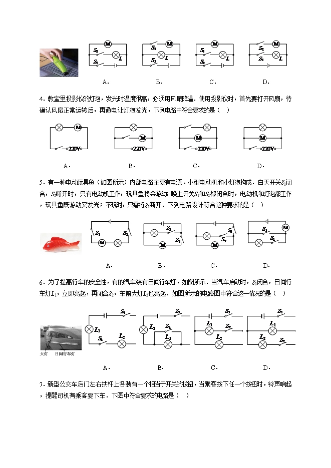 【内容简介】(一)改进小彩灯的连接电路1.彩灯已成为人们过节必备的装饰品,起到了美化环境、渲染气氛的作用.如图甲所示的小彩灯是______联在一起的,这个电路的不足之处是__________________. 甲乙丙丁2.如图乙所示是改进后的小彩灯的连接图,请在图丙的虚线框内画出其电路图.这种连接方式的优点是________________________,不足之处是________________________.请你对小彩灯的电路进行进一步的改进,并在图丁的虚线框内画出电路图.(二)回答问题正确显示器如图所示是一个同学制作的回答问题正确显示器.在一块长方形硬纸板上,别上两排曲别针.左排曲别针表示问题,一个曲别针旁写一个问题.右排曲别针表示相应的答案,一个曲别针旁写一个答案.把干电池和小灯泡连接起来,并留出两个接线头A和B.提问者把接线头A与左排的一个曲别针接触,表示提出一个问题,要求回答者把接线头B与右排的一个曲别针接触,表示选出一个答案.1.它是利用电路______的原理制成的,回答正确时灯泡______,回答错误时灯泡______.2.请你用笔画线代替导线在将硬纸板后面的电路连接完整.(三)病房呼叫电路细心的小明在病房发现每张病床的床头都有一个如图甲所示按钮,按下按钮后,值班护士就会过来看护病人,则该按钮相当于一个______.按下按钮后,为什么值班护士马上就知道哪个病床需要看护呢?小明又对护士值班室进行了查看.在值班室的墙壁上看到了一些与床号相对于的指示灯,如图乙所示.小明根据观察到的现象画出了如图丙所示的电路,请你就此电路进行评价:____________________________________.请在图丁的虚线框内画出你改进后的电路. 甲乙丙丁二、易错分析1.电路的设计应根据题目的需要及串并联电路的特点进行,设计完成后应检查所设计的电路是否满足需要.2.用电器短路是设计电路问题的常考项目,设计电路时应抓住用电器短路的典型特征:开关断开时用电器工作,开关闭合时用电器反而工作.三、达标训练1.下列是四种模拟病房呼叫电路的设计图,其中设计最佳的是( ) A.B.C.D.2.如图所示是一个简易“选答器”.一个问题有两个可选择的答案(a)和(b),与它们对应的灯分别由两个按钮(开关)控制,选择哪一个答案就按下哪一个按钮,对应的灯就亮,那么图中所示各电路图中符合要求的是( )