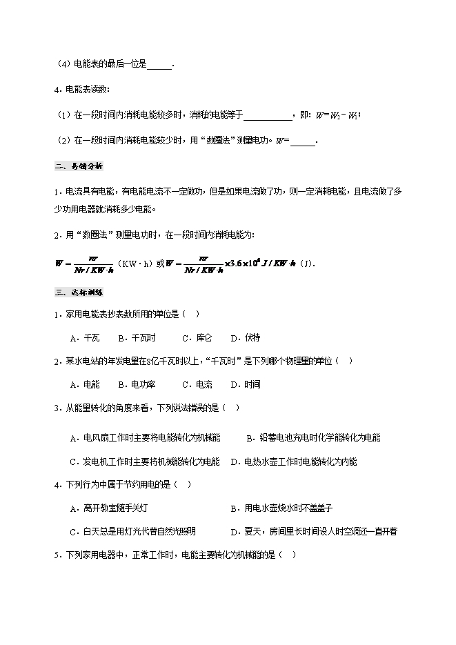 【内容简介】一、知识梳理(一)电能与电功1.电热器工作时,______通过电阻丝时以______的方式使电热器发热。在此过程中______能转化为______能;电动机工作时,______通过电动机时以______的方式使电动机转动。在此过程中______能转化为______能;可见,电流可以______。2.电能的转化:电流具有______,用电器消耗电能的过程实质是将______能转化为______能量的过程.3.电功(1)概念:____________叫做电功.用电器消耗多少电能,就有多少______能转化为______的能量,我们就说电流做了多少功;(2)符号:______;(3)单位:①国际单位:______,简称______,符号______;②常用单位:______,俗称______,符号______;③换算关系:lkW•h=______J.(二)测量电功1.测量电功的仪表:______2.电能表的单位:______(度)3.电能表上一些重要参数:(1)“220V 50Hz”:220V表示____________,50Hz表示:____________;(2)“5(10)A”中5A表示:__________________,10A表示 __________________;(3)“1200r/ kW•h”表示:________________________,“3200imp/ kW•h” 表示:__________________;(4)电能表的最后一位是______.4.电能表读数:(1)在一段时间内消耗电能较多时,消耗的电能等于____________,即:W=W2-W1;(2)在一段时间内消耗电能较少时,用“数圈法”测量电功。W=______. 二、易错分析1.电流具有电能,有电能电流不一定做功,但是如果电流做了功,则一定消耗电能,且电流做了多少功用电器就消耗多少电能。2.用“数圈法”测量电功时,在一段时间内消耗电能为: