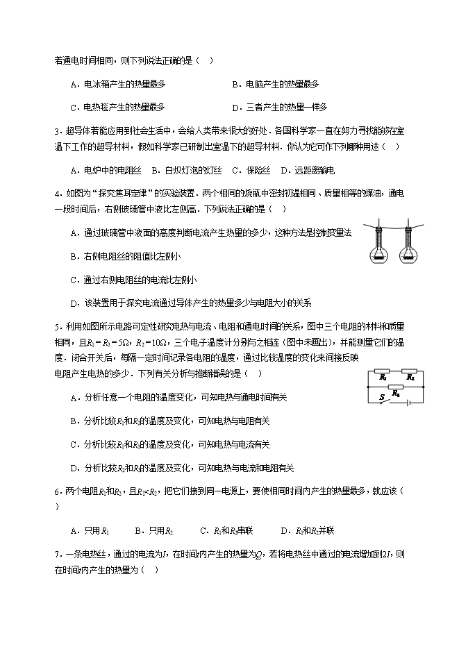 【内容简介】一、知识梳理(一)电流的三大效应1.电流的热效应:______能转化为______能的现象.2.电流的三大效应分别是电流的______效应、电流的______效应、电流的______效应.(二)电流的热效应与什么因素有关1.实验探究:影响电流热效应的因素(1)猜想与假设:根据已有知识和生活经验,电流的热效应可能与______、______、______有关;(2)设计实验:①科学方法:该实验需探究一个物理问题与多个因素有关,实验时应采用____________法,实验中是通过__________________比较产生电热的多少的,这种方法称为______法.②设计电路:A.若探究电热Q与电阻R的关系,应保持______、______相同,______不同,应选择______或______图进行实验;B.若探究电热Q与电阻I的关系,应保持______、______相同,______不同,应选择______或______图进行实验\;(3)进行实验:①通过实验发现甲图中装有电阻______的玻璃瓶中液柱上升较多,这说明在电流、通电时间相同时,电阻越______,导体产生的热量越多;②通过实验发现丙图中装有电阻______的玻璃瓶中液柱上升较多,这说明在电阻、通电时间相同时,电流越______,导体产生的热量越多.2.结论:(1)在相等时间内,电流相同时,电阻越大,导体产生的热量越______;(2)在相等时间内,电阻相同时,电流越大,导体产生的热量越______;(3)在电阻及通过导体的电流一定时,通电时间越长,导体产生的热量越______.(三)焦耳定律1.内容:电流通过导体产生的热量跟____________成正比,跟______成正比,跟____________成正比.2.公式:____________.(四)电流热效应的利用与危害1.电热的利用:电热器(1)电热器的原理:是利用电流______效应制成的.(2)电热器的主要组成部分是发热体——选用电阻率______、熔点______的合金丝做成.(3)电热器的优点:____________,热效率高,便于控制.2.电热的危害:使绝缘体______;烧坏用电器.3.防止电热危害的措施:设法减少电热;____________.