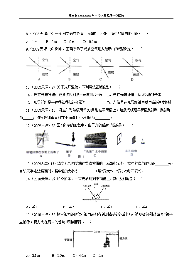 【内容简介】1.(2005天津,3)物体到平面镜镜面的距离是2m,则该物体在平面镜中的像到镜面的距离是 ( ) A.1m B.2m C.3m D.4m【答案】B【解析】因为平面镜成像的特点之一是像距与物距相等,已知物体到平面镜镜面的距离是2m,可得该物体在平面镜中的像到镜面的距离是2m.故选B。2.(2005天津,12,多选)入射光线与平面镜夹角为θ,则( )A.入射角为 B.入射角为90°¬-θC.反射光线与入射光线夹角为180°¬— D.反射光线与入射光线的夹角为 【答案】BC【解析】入射光线与平面镜夹角为θ,由于法线与镜面垂直,故入射角为90°-θ,反射角等于入射角,也为90°-θ,所以入射光线与反射光线的夹角为180°-2θ.故选B、C.3.(2005天津,19,填空)一束光线从玻璃射向空气,如图所示,则折射角为____________。 【答案】30°【解析】根据光路图,认清入射光线、折射光线、折射角,根据图中给出的角度计算出折射角的大小,图中折射光线与界面之间的夹角为60°,折射角为90°﹣60°=30°4.(2006天津,4)晴天,树阴下的地面上出现的圆形光斑是( )A.太阳的实像B.太阳的影子C.太阳的虚像D.树叶的影子【答案】A【解析】树阴下的地面上出现的圆形光斑是太阳光通过浓密的树叶中的小孔所成的太阳的像,是实像,是由光的直线传播形成的.故选A5.(2006天津,5)在图中,画出了光线射在空气与玻璃的界面处发生反射和折射的四幅光路图,其中正确的是( ) 【答案】C 【解析】光从玻璃斜射入空气时,发生反射和折射,反射角等于入射角,折射角应大于入射角,所以A错误.光从空气斜射入玻璃,在界面发生反射,反射角等于入射角.在发生折射时,折射光线与入射光线应分居法线两侧,折射角小于入射角,折射光线要靠近法线,所以B、D错误,C正确.6.(2007天津,3)光线从空气斜射入水中发生折射,图中描述折射的四幅光路图正确的是( ) 【答案】A【解析】光线从空气斜射入水中,折射角小于入射角,所以折射光线要靠近法线.所以BC错误,A正确.折射光线与入射光线分居法线两侧,所以D错误.故选A7.(2007天津,4)关于光的反射,下列说法正确的是( )A. 当入射光线与反射面的夹角为20°时,反射角也为20°B. 入射光线靠近法线时,反射光线也靠近法线C. 入射角增大5°时,反射光线与入射光线的夹角也增大5°D. 镜面反射遵守光的反射定律,漫反射不遵守光的反射定律【答案】B 【解析】当入射光线与反射面的夹角为20°时,则入射角为90°-20°=70°,所以反射角也为70°,所以A说法错误.入射光线靠近法线时,入射角减小,所以反射角也减小,反射光线靠近法线,所以B说法正确.入射角增大5°时,反射角也增大5°,所以反射光线与入射光线的夹角也增大10°.所以C说法错误.镜面反射和漫反射的每条光线都要遵循光的反射定律,所以D说法错误.故选B