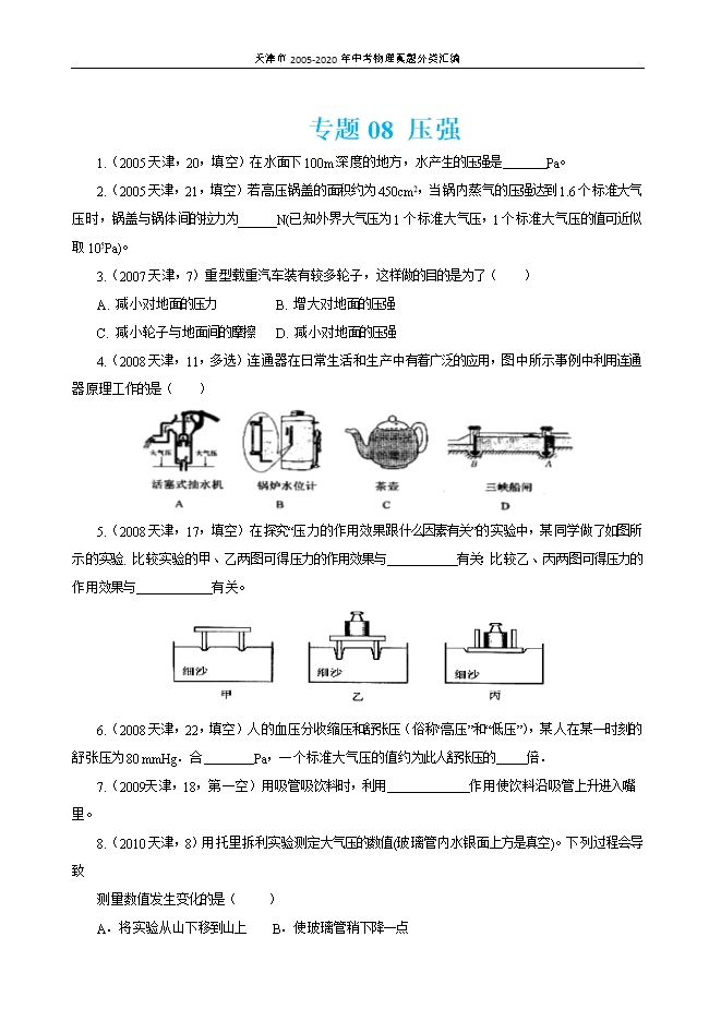 【内容简介】1.(2005天津,20,填空)在水面下100m深度的地方,水产生的压强是 Pa。【答案】9.8×105【解析】水产生的压强:p=ρgh=1.0×103kg/m3×9.8N/kg×100m=9.8×105Pa2.(2005天津,21,填空)若高压锅盖的面积约为450cm2,当锅内蒸气的压强达到1.6个标准大气压时,锅盖与锅体间的拉力为______N(已知外界大气压为1个标准大气压,1个标准大气压的值可近似取105Pa)。【答案】2.7×103【解析】高压锅盖的面积为S=450cm2=0.045m2。高压锅内蒸气的压强达到1.6个标准大气压, 外界大气压为1个标准大气压,内外压强差是,ΔP=1.6P0- P0=0.6 P0=0.6×105Pa。(P0=1个标准大气压=105Pa),锅盖与锅体间的压力为,F=ΔP×S=0.6×105Pa×0.045m2=2700N3.(2007天津,7)重型载重汽车装有较多轮子,这样做的目的是为了( )A. 减小对地面的压力B. 增大对地面的压强C. 减小轮子与地面间的摩擦D. 减小对地面的压强【答案】D【解析】(1)载重汽车的重力一定,对地面的压力一定,故选项A错误;(2)载重汽车对地面的压力一定,轮子越多,与地面的接触面积就越大,对地面的压强就越小.故选项B错误,选项D正确;(3)轮子越多,只是面积增加,接触面积的大小对摩擦力没有影响,故选项C错误.故选D4.(2008天津,11,多选)连通器在日常生活和生产中有着广泛的应用,图中所示事例中利用连通器原理工作的是( ) 【答案】BCD【解析】上端开口下端连通的容器.连通器里只有一种液体,在液体不流动的情况下,连通器各容器中液面的高度总是相平的.A、活塞式抽水机是利用大气压来工作的;B、锅炉水位计是利用连通器的原理制成的;C、茶壶是利用连通器的原理制成的;D、三峡船闸也是利用连通器的原理工作的,故选BCD。5.(2008天津,17,填空)在探究“压力的作用效果跟什么因素有关”的实验中,某同学做了如图所示的实验. 比较实验的甲、乙两图可得压力的作用效果与 有关:比较乙、丙两图可得压力的作用效果与 有关。 【答案】压力大小;受力面积【解析】比较实验的甲、乙两图,受力面积大小相同,压力不同,可得压力的作用效果与压力大小有关;比较乙、丙两图,压力大小相同,受力面积不同,可得压力的作用效果与受力面积大小有关。6.(2008天津,22,填空)人的血压分收缩压和舒张压(俗称“高压”和“低压”),某人在某一时刻的舒张压为80 mmHg.合 Pa,一个标准大气压的值约为此人舒张压的 倍.【答案】10880;9.5【解析】P=ρgh=13.6×103kg/m3×10N/kg×80×10-3m=1.088×104Pa;因为1个标准大气压的值约为1.01×105Pa,所以一个标准大气压的值约为此人舒张压的9.5倍。7.(2009天津,18,第一空)用吸管吸饮料时,利用 作用使饮料沿吸管上升进入嘴里。【答案】大气压强 【解析】用吸管吸饮料时,吸管内气压减小,小于外界大气压,在大气压的作用下饮料被压入吸管。