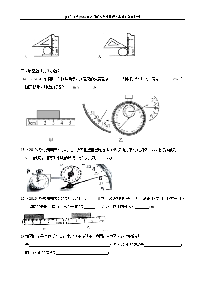 [精品专辑]2020秋苏科版八年级物理上册课时同步检测:5.1 长度和时间的测量(原卷版和解析版)