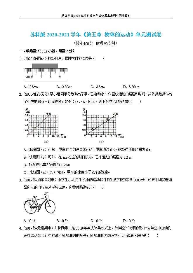 - 810第五章 物体的运动--2021秋苏科版八年级物理上册单元基础和提优卷(原卷版和解析版)