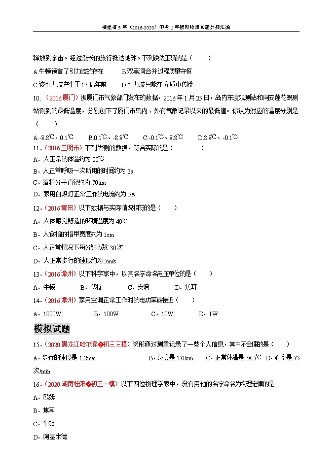 福建省5年(2016-2020)中考1年模拟物理真题分类汇编:专题18 估测估算、物理常识(原卷版和解析版)