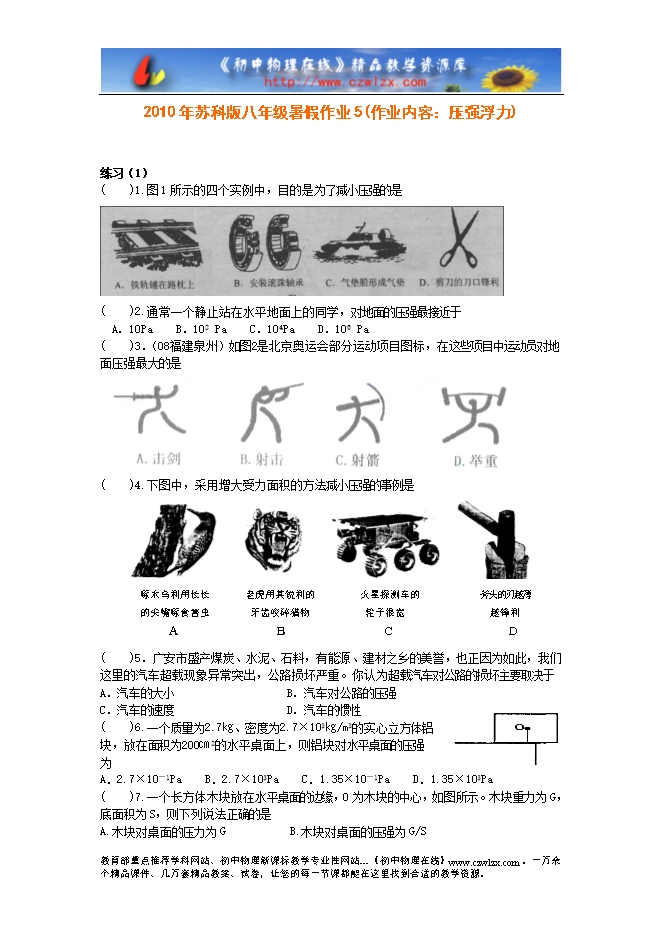 2010年苏科版八年级暑假作业5(作业内容:压强浮力)