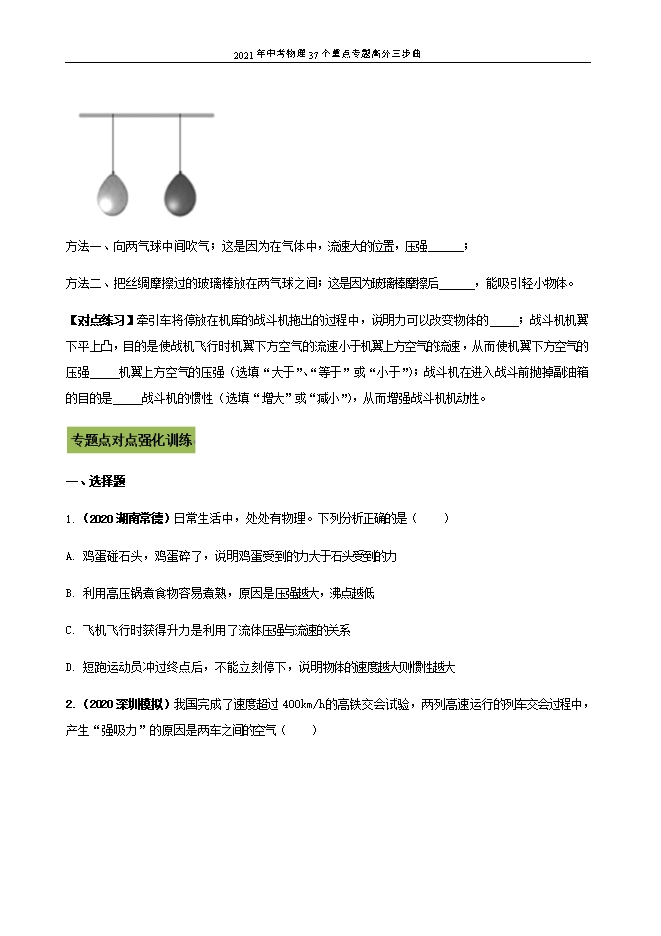 【内容简介】1.流体压强与流速关系流体压强大小与流速关系:在流体中流速越大地方,压强越小;流速越小的地方,压强越大。2.液体压强与流速的关系的应用飞机的机翼通常都做成上面凸起、下面平直的形状。当飞机在机场跑道上滑行时,流过机翼上方的空气速度大、压强小,流过机翼下方的空气速度小、压强大。机翼上下方所受的压力差形成向上的升力。 【例题1】(2020苏州)小明采用“向漏斗口吹气,观察乒乓球状态”的方法来探究流速对流体压强的影响。以下方案不合理的是( ) A.竖直向上吹气 B.水平向右吹气 C.竖直向下吹气 D.斜向下吹气【答案】A【解析】A.不吹气时,乒乓球受到的重力和支持力是平衡力,乒乓球处于静止状态;竖直向上吹气时,乒乓球底部空气流速大压强小,乒乓球上面流速小压强大,产生向下的压力,乒乓球受竖直向下的重力,乒乓球还受到支持力作用,这三个力是平衡力,乒乓球也处于静止状态,所以竖直向上吹气没有改变乒乓球的运动状态,不能很好的探究流体流速对流体压强的影响,故选项正确。B.不吹气时,乒乓球由于重力作用会滚下来,水平向右吹气时,乒乓球左侧空气流速大压强小,乒乓球右侧空气流速小压强大,产生向左的压力,乒乓球保持静止状态,所以水平向右吹气改变了乒乓球的运动状态,可以探究流速对流体压强的影响,故选项错误。C.不吹气时,乒乓球由于重力作用会滚下落,竖直向下吹气时,乒乓球上方空气流速大压强小,乒乓球下方空气流速小压强大,产生向上的压力,乒乓球保持静止状态,所以竖直向下吹气改变了乒乓球的运动状态,可以探究流速对流体压强的影响,故选项错误。D.不吹气时,乒乓球由于重力作用会滚下来,斜向下吹气时,乒乓球右上方空气流速大压强小,乒乓球左下方空气流速小压强大,产生向右上方的压力,乒乓球保持静止状态,所以斜向下吹气改变了乒乓球的运动状态,可以探究流速对流体压强的影响,故选项错误。