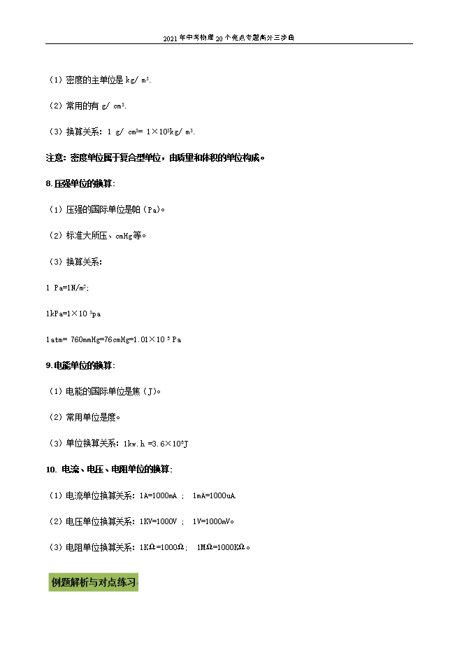【内容简介】1.长度单位及换算(1)国际单位:米(m)。(2)常用单位:千米(km)、分米(dm)、厘米(cm)、毫米(mm)、微米(um)、纳米(nm)等。(3)单位换算:1千米=1000米 1km=1000m1米=10分米 1m=10dm1分米=10厘米 1dm=10cm1厘米=10毫米 1cm=10mm1毫米=1000微米 1mm=1000um1微米=1000纳米 1um =1000nm2.面积单位及换算(1)国际单位制中,面积的单位为平方米(m2)。(2)常用单位还有平方分米(dm2)、平方厘米(cm2)等。(3)单位换算: 1m2=102dm2、1dm2=102cm2、1m2=104cm2 3.体积单位及换算(1)国际单位制中,体积的单位为立方米(m3)。(2)常用单位还有立方分米(dm3)、立方厘米(cm3)、升(L)、毫升(mL)等。(3)单位换算:1L=1dm3、1mL=1cm3、1m3=103dm3=106cm3、1L=1000mL。4.质量单位及其换算;(1)质量的国际单位是千克(kg)。(2)常用的单位有克(g),吨(t),毫克(mg)等。(3)单位换算:1吨=1000千克; 1千克=1000克; 1克=1000毫克。1t=1000kg; 1kg=1000g; 1g=1000mg。5.时间单位的换算:(1)时间的国际单位是秒,符号S,(2)时间的单位常用的有小时(h)、分钟(min)等。(3)它们之间的换算关系是:1小时=60分钟1分钟=60秒1小时=3600秒1世纪=100年1年=12月1月=28或29或30或31日1日=24时 6.速度单位的换算:(1)速度的国际单位是米/秒(m/s)(2)常用单位有千米/小时(km/h)(3)换算关系:1m/s=3.6km/h1km/h=5/18m/s注意:速度单位属于复合型单位,由长度和时间的单位构成。7.密度单位的换算:(1)密度的主单位是kg/ m3.(2)常用的有g/ cm3.(3)换算关系:1 g/ cm3= 1×103kg/ m3. 注意:密度单位属于复合型单位,由质量和体积的单位构成。8.压强单位的换算:(1)压强的国际单位是帕(Pa)。(2)标准大所压、cmHg等。(3)换算关系:1 Pa=1N/m2;1kPa=1×10 3pa 1atm= 760mmHg=76cmHg=1.01×10 5 Pa9.电能单位的换算:(1)电能的国际单位是焦(J)。(2)常用单位是度。(3)单位换算关系:1kw.h =3.6×106J10. 电流、电压、电阻单位的换算:(1)电流单位换算关系:1A=1000mA ; 1mA=1000uA.(2)电压单位换算关系:1KV=1000V ; 1V=1000mV。(3)电阻单位换算关系:1KΩ=1000Ω; 1MΩ=1000KΩ。 【例题1】(2020湖南岳阳)对物理量的关系式理解正确的是( )A. 由 可知,物质的密度与质量成正比B. 由 可知,物体的速度与路程成正比C. 由 可知,电流一定时,电阻与电压成正比D. 由 可知,受力面积一定时,压强与压力成正比【答案】D