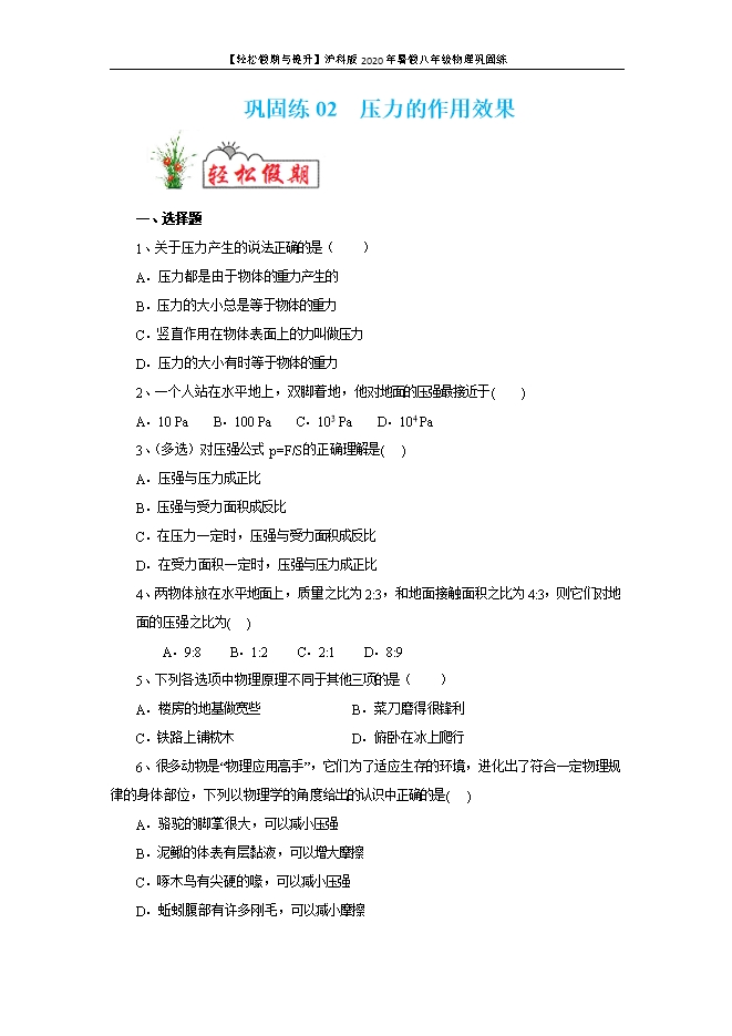 【内容简介】1.戴黄色眼镜看白纸,白纸变成黄色,这是由于( )。A、白纸反射的光通过黄色镜片时,被镜片染上了黄色;B、白纸能反射黄色的光;C、通过黄色镜片看一切有颜色的物体都是黄色;D、黄色镜片只透过白纸反射光中的黄光【答案】D。【解析】A、白纸反射的光通过黄色镜片时,不会被镜片染上了黄色,而是只有黄光可以通过,故A错误。B、白纸能反射黄色的光,但这不是人看到白纸变成黄色的根本原因,故B错误。C、通过黄色镜片看黄色物体是黄色,但看其它颜色的物体都是黑色,故C错误。D、当多种色光射向透明的黄色镜片时,透明的黄色眼镜片只让黄光通过,其他的颜色被透明的黄色眼镜片吸收,只有黄光进入人的眼睛,人感觉白纸变成黄色;故D正确。故选D。2.我们看到大海平静时,海水呈蓝色,其主要原因是( )。A、海水里有盐分;B、蔚蓝色天空映照的结果;C、太阳经漫反射产生的结果;D、其他色光被海水吸收,短波的蓝光和紫光被海水反射和散射的结果【答案】D。【解析】海水其实并不是蓝色的,海水之所以呈现蓝色,那是因为阳光照射到海水里又产生反射的结果。海水具有良好的吸收阳光的功能,当阳光照到海水里时,红光,大部分紫光以及五分之四的蓝光,在50m的深处都被吸收了,只有五分之一的蓝光逃脱了这个命运,被反射回来;所以在人们的视觉中,大海就成了蔚蓝色的世界。故选D。3.下列现象中属于光的色散现象的是( )。 A.透过树丛的光束;B.平面镜中蜡烛的像;C.用鱼叉叉水中的鱼;D.透过三棱镜的太阳光【答案】D。【解析】A.透过树丛的光束;是光的直线传播形成的现象。不符合题意。B.平面镜中蜡烛的像;此是平面镜成像,是光的反射现象;故不符合题意。C.用鱼叉叉水中的鱼;看到水中的鱼是光的折射现象;不符合题意。D.透过三棱镜的太阳光;看到的是各种颜色的彩色光,这是光的色散现象;故D符合题意。4.下列光现象与其成因对应正确的是( )。A.海市蜃楼—光的色散; B.雨后彩虹—光的直线传播;C.水中“倒影”—光的反射;D.形影不离—光的折射【答案】C。【解析】海市蜃楼是光的折射现象引起的,不是色散,故A错;雨后的彩虹是光的色散现象,是光的折射引起的,不是因为光的直线传播,故B错;水中倒影,是由于水岸上的物体发出的光,经水面反射射入我们眼睛看到的,故水中倒影属于光的反射,故C正确;形影不离,说的是物体和物体影子总是在一起的,物体走到哪里影子跟到哪里,但影子的形成是光的直线传播形成的,故D错。5.下列对光现象描述的正确的是( )。A.“手影”形成的原因是光的直线传播;B.日食形成是光的色散现象;C.人离平面镜越近,镜中所成的像越大;D.在医院的手术室,病房里常用红外线来杀菌【答案】A。【解析】手影的形成是由于光的直线传播,故A正确;日食形成也是由于光的直线传播,故B错;人在平面镜中成像与人到平面镜之间的距离无关,故C错;红外线具有较好热效应,不具有杀菌作用,故D错。
