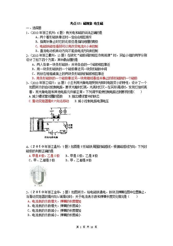 2010中考物理试题分类汇编(93套)专题十二--磁现象 电生磁