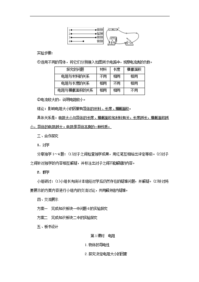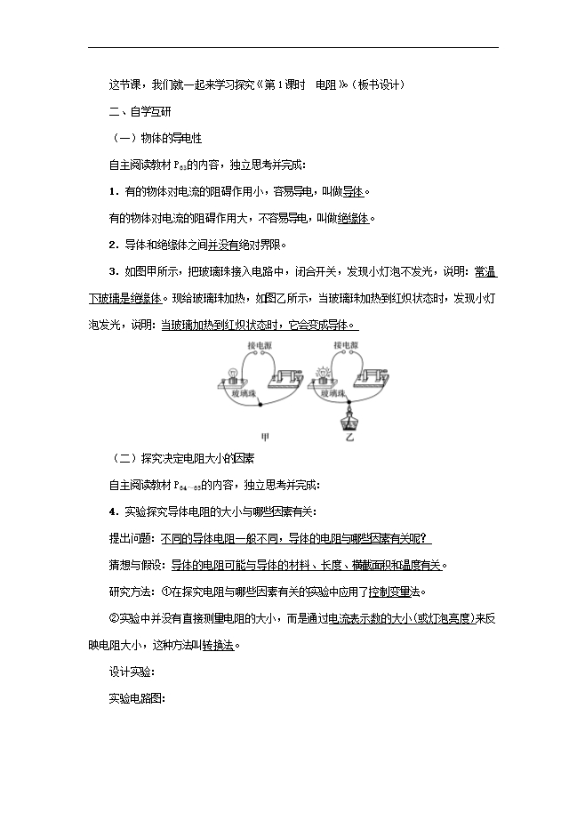 【内容简介】1.了解物体的导电性能。2.知道电阻及其单位。探究决定电阻大小的因素。3.了解变阻器的构造、在电路中的符号,理解变阻器的工作原理。4.通过用变阻器改变灯泡的亮度,知道正确使用变阻器的方法。了解滑动变阻器的种类及特征、在电路中的作用。5.培养学生动手能力和观察能力,激发学生学习物理知识的兴趣,同时教育学生学习欧姆不懈努力探究的精神。教学重点电阻的大小与哪些因素有关。教学难点理解导体的电阻是导体本身的一种性质。课时安排2课时课前准备课件教学过程一、导入新课第1课时 电阻如图水在向前流动的过程中会受到一些阻碍作用,如石头对水的阻碍等;电荷在导体中发生定向移动时也会受到一定的阻碍。 这节课,我们就一起来学习探究《第1课时 电阻》。(板书设计)二、自学互研(一)物体的导电性自主阅读教材P63的内容,独立思考并完成:1.有的物体对电流的阻碍作用小,容易导电,叫做导体。有的物体对电流的阻碍作用大,不容易导电,叫做绝缘体。2.导体和绝缘体之间并没有绝对界限。3.如图甲所示,把玻璃珠接入电路中,闭合开关,发现小灯泡不发光,说明:常温下玻璃是绝缘体。现给玻璃珠加热,如图乙所示,当玻璃珠加热到红炽状态时,发现小灯泡发光,说明:当玻璃加热到红炽状态时,它会变成导体。