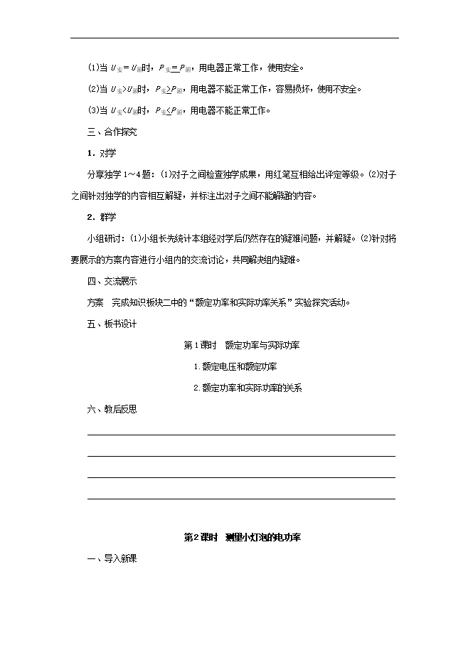【内容简介】教学目标1.认识额定电压和额定功率,正确理解额定功率和实际功率的关系。2.知道决定灯泡亮度的因素,会用伏安法测小灯泡的电功率。3.会初步分析电路故障,会进行电功率的综合运算。4.通过探究,体验小灯泡的电功率随它两端电压的改变而改变,并发现其变化的规律。5.认识用电器正常工作和正常工作对用电器的影响,培养学生科学使用用电器的意识以及节约用电的意识。教学重点用伏安法测量小灯泡实际功率的方法。教学难点自己设计实验电路,实验表格和实验步骤。课时安排2课时课前准备课件教学过程第1课时 额定功率与实际功率一、导入新课 这节课,我们就一起来学习探究《额定功率与实际功率》。(板书设计)二、自学互研(一)额定电压和额定功率自主阅读教材P98~99的内容,独立思考并完成:1.调查一下家里有哪些用电器,按下列要求填入表格中。电器名称额定电压额定功率功能电视机220V200W收看电视节目洗衣机220V500W洗衣服…………2.用电器的铭牌上所标正常工作时的电压值,叫做额定电压。3.用电器上所标的功率,是它在额定电压下工作时的功率,叫做额定功率。(二)额定功率和实际功率的关系自主阅读教材P99的内容,独立思考并完成:4.如图所示是小华同学探究额定功率与实际功率关系的实验,他选取了一个标有“2.5V”的小灯泡进行实验,并连续进行了四次测量,下表所示的是他得到的实验数据和观察到的现象。