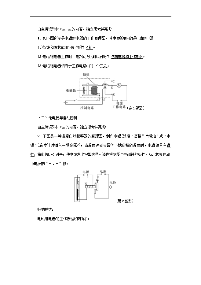 【内容简介】教学目标1.了解电磁继电器的结构和工作原理。2.知道如何使用电磁继电器。3.通过阅读说明书和观察电磁继电器,知道如何使用电磁继电器,提高学生的观察、分析及操作能力。4.通过了解物理知识的实际应用,认识科学发明就在我们身边,认识科学及其相关技术对社会发展、人类生活的影响,提高学习物理的兴趣。教学重点电磁铁的特性和应用、电磁继电器的构造和工作原理。教学难点电磁铁的特性、电磁继电器的工作原理。课时安排1课时课前准备课件教学过程一、导入新课 这节课,我们就一起来学习探究《第四节 电磁继电器》。(板书设计)二、自学互研(一)认识电磁继电器自主阅读教材P119~120的内容,独立思考并完成:1.如下图所示是电磁继电器的工作原理图,其中虚线框内就是电磁继电器。(1)衔铁和铁芯能用钢制作吗?不能。(2)电磁继电器工作时,电路可分为哪两部分?控制电路和工作电路。(3)电磁继电器相当于工作电路中的一个开关。 (第1题图)(二)继电器与自动控制自主阅读教材P121的内容,独立思考并完成:2.下图是一种温度自动报警器的原理图,制作水银(选填“酒精”“煤油”或“水银”)温度计时插入一段金属丝,当温度达到金属丝下端所指的温度时,电磁铁具有磁性,将衔铁吸引过来,使电铃发出报警信号。请你根据图中电磁铁的极性,标出控制电路中电源的“+、-”极。