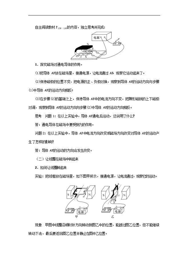 【内容简介】教学目标1.了解磁场对通电导线的作用。2.了解直流电动机的结构和工作原理;初步认识科学技术与社会之间的关系。3.通过“探究磁场对电流的作用”,培养学生的观察能力和分析概括能力。4.通过“动手做”培养学生的动手能力,鼓励学生积极开展小发明、小制作活动。5.通过介绍电动机发展历程和应用,使学生了解科技进步是人类社会进步的巨大推动力,培养学生学习科学、热爱科学、关注科技进步的良好科学素养。教学重点探究磁场对电流的作用规律。教学难点解决电动机在工作过程的换向问题和制作小电动机。课时安排1课时课前准备课件教学过程一、导入新课 磁场能否对电流产生作用,通过今天这节课的学习,我们会找到答案的。这节课,我们就一起来学习探究《第二节 磁场对电流的作用》。(板书设计)二、自学互研(一)磁场对通电导体的作用自主阅读教材P129~130的内容,独立思考并完成: 1.探究磁场对通电导体的作用。(1)把导体AB放在磁场里,接通电源,让电流通过AB,观察它运动起来了。(2)保持磁极的位置不变,把电源的正、负极对换,观察到导体AB的运动方向与步骤(1)中导体AB的运动方向相反;(3)在步骤(2)的基础之上,保持导体AB中的电流方向不变,把蹄形磁铁的上下磁极对调,观察到导体AB的运动方向与步骤(2)中导体AB的运动方向相反。思考 问题1:在以上实验中,导体AB通电后运动,这说明了什么?答:通电导体在磁场中要受到力的作用。问题2:在以上实验中,导体AB中电流方向改变或磁场方向改变对导体AB的运动产生了怎样的影响?答:导体AB的运动的方向会发生改变。(二)让线圈在磁场中转起来2.如何让线圈转起来实验:把线框放在磁场里,如下图甲所示,接通电源,让电流通过,观察它的运动。
