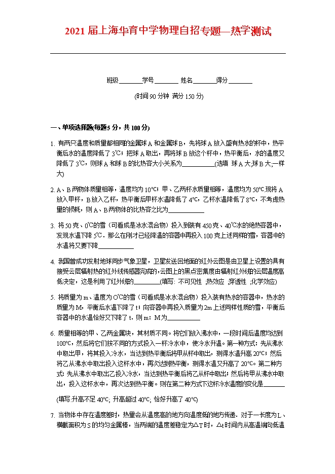 [精品专题]热学测试--2021届上海市华育中学自主招生招物理专题(附答案)