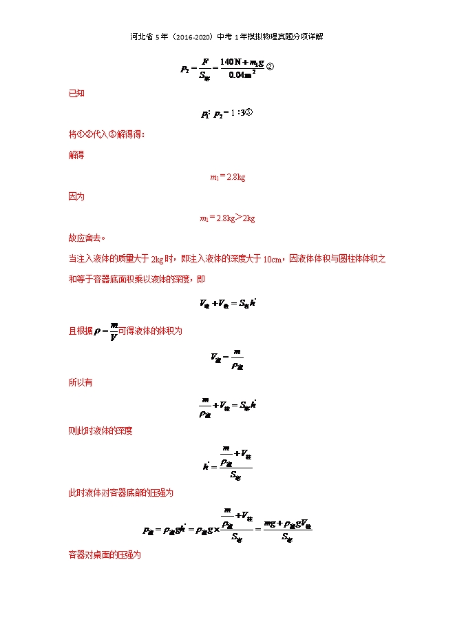 【内容简介】1.(2020河北)边长为20cm的薄壁正方形容器(质量不计)放在水平桌面上,将质地均匀的实心圆柱体竖直放在容器底部,其横截面积为200cm2,高度为10cm。如图1所示。然后向容器内缓慢注入某种液体,圆柱体始终直立,圆柱体对容器底部的压力与注入液体质量的关系如图2所示。(g取10Nkg)(1)判断圆柱体的密度与液体密度的大小关系,并写出判断依据;(2)当圆柱体刚被浸没时,求它受到的浮力;(3)当液体对容器底部的压强与容器对桌面的压强之比为1:3时,求容器内液体的质量。 2.(2019河北)小明用如图1所示的装置探究“影响浮力大小的因素”(已知ρ水=1.0×103kg/m3,取g=10N/kg) (1)小明利用图1甲所示的实验装置,将圆柱体合金块慢慢浸入水中时,根据测得的实验数据,作出了弹簧测力计示数F示与合金块下表面所处深度h的关系图象(如图2①所示)。实验过程中合金块所受浮力的变化情况是________________________;请在图2中画出F浮随h变化的关系图象。(__________)分析图象可知,浸没在水中的物体所受浮力的大小跟它排开水的体积成____________。(2)将合金块分別浸没在水和某液体中(如图1乙、丙所示),比较图1甲、乙、丙可知: ___________;(3)合金块的密度为ρ合金____________g/cm3;(4)若用此合金块制成一个空心合金球,当合金球恰好能悬浮于图1丙所示液体中时,空心部分的体积是____________cm3。3.(2018河北).实心圆柱体甲和长方体乙分别放置在水平地面上,甲的密度为0.6×103 kg/m3,质量为12 kg,底面积为4×10−2 m2;乙的质量为5.4 kg,边长分别为0.1 m、0.2 m 0.3 m.(g取10 N/kg)(1) 求乙的密度_____.(2) 求甲直立时对水平地面的压强_____.(3)若在甲的上方水平截去一段并叠放在乙的正上方后,甲剩余圆柱体对水平面的压强恰好等于此时乙对水平地面压强的最小值,求甲截去的高度_____.4.(2017河北)如图所示,薄壁圆柱形容器置于水平地面,容器的底面积S=8×10﹣3m2,容器高0.2m,内盛0.17m深的水.A1和A2为两个均匀实心立方体物块(不吸水),A1的质量为0.185kg,A2的体积为3.2×10﹣4m3,(已知ρ水=1.0×103kg/m3,g取10N/kg). (1)水对容器底部的压力为多少?(2)将A1释放,沉浸在水中,静止后受到容器底对它的支持力为0.6N,求A1的体积.(3)只将A2缓慢浸入在水中,当水对容器底部的压强最大时,A2的密度至少为多少?