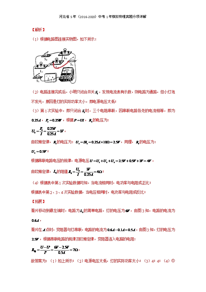 【内容简介】1.学习了电功率后,小明利用如图1所示的电路图来探究小灯泡功率跟电阻的关系。 规格为“ ”、 额定电压是 、 额定电压是 ,可调电压电源。图3是小灯泡 和 的 图象。 (1)请根据图1所示电路图用笔画线代替导线将图2所示实物图补充完整。(2)电路连接完成后,小明只闭合开关 ,发现电流表有示数,但小灯泡不发光,原因是 电源电压太低,灯的实际功率太小 。(3)如表是实验中的相关数据。实验次数开关状态电源电压电流表示数小灯泡电阻小灯泡功率1只 闭合 2只 、 闭合 3只 、 闭合 4 、 、 均闭合 第1次实验中电源电压 , 的阻值 。(4)分析表中数据可得出,规格不同的小灯泡消耗的实际功率跟电阻的关系是:① ;② 。【拓展】完成实验后,老师告诉小明用一个稳压电源和一个滑动变阻器可以制作成一个可调电压电源。将自制的可调电压电源(稳压电源电压恒为 、电流表、小灯泡 和开关串联,如图4所示。将滑片置于阻值最大处,闭合开关,向左移动滑片,当滑片从 点滑到最左端 点时 、 两点图中未标出),电流表示数变化了 ,则 。【分析】(1)根据电路图连接实物图;(2)电路连接完成后,小明只闭合开关 ,发现电流表有示数,则电路为通路,根据小灯泡不发光分析原因;(3)第1次实验中,即只闭合 时,分析电路连接,根据串联电路电流的规律,根据 得出 的电压,由欧姆定律求出 的电压,同理求出 的电压,根据串联电路电压的规律得出电源电压;由欧姆定律求出 的阻值 ;(4)根据表中第1次实验数据得出结论;根据表中第2、3、4次实验数据得出结论;【拓展】滑片移动到最左端时,电路为 的简单电路,可知灯的电压为 ,由图3得出电路的电流;滑片在 点时,变阻器与灯串联,根据电路的电流变小可知电路的电流大小,由图3可知灯的电压,根据串联电路的规律及欧姆定律求出变阻器连入电路的电阻。【解析】(1)根据电路图连接实物图,如下所示: (2)电路连接完成后,小明只闭合开关 ,发现电流表有示数,则电路为通路,但小灯泡不发光,原因是灯的实际功率太小,即电源电压太低;(3)第1次实验中,即只闭合 时,三个电阻串联,因串联电路各处的电流相等,即为 , ,根据 , 的电压为: ,由欧姆定律, 的电压为: ,同理, 的电压为: ;根据串联电路电压的规律,电源电压 ,由欧姆定律, 的阻值 ;(4)根据表中第1次实验数据可知,当电流相同时,电功率与电阻成正比;根据表中第2、3、4次实验数据,当电压相同时,电功率与电阻成反比;【拓展】滑片移动到最左端时,电路为 的简单电路,灯的电压为 ,由图3知,电路的电流为 ,滑片在 点时,变阻器与灯串联,电路的电流为 ,由图3知,灯的电压为 ,根据串联电路的规律及欧姆定律,变阻器连入电路的电阻: ,故答案为:(1)如上所示;(2)电源电压太低,灯的实际功率太小;(3)4;4;(4)①当电流相同时,电功率与电阻成正比;②当电压相同时,电功率与电阻成反比;【拓展】7。【点评】本题探究小灯泡功率跟电阻的关系,考查电路连接、反常现象的分析、串联电路的规律及欧姆定律的运用和控制变量法、数据分析的能力。2.(2019河北)如图所示,电源电压不变,R1、R2为定值电阻,R为滑动变阻器,a、b是电流表或电压表。当只闭合开关S、S1时,a、b的指针均明显偏转,将位于中点的滑片P向左移动。a的示数不变,b的示数有变化。以下说法正确的是