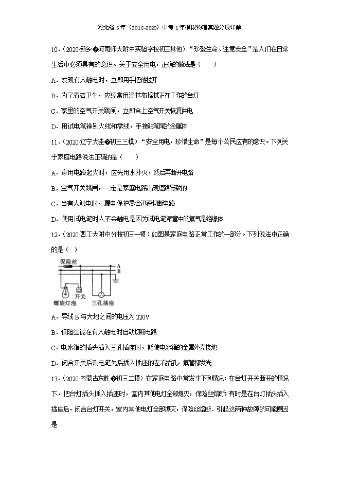 专题19 家庭电路和安全用电--河北省5年(2016-2020)中考1年模拟物理真题分项详解(原卷版和解析版)