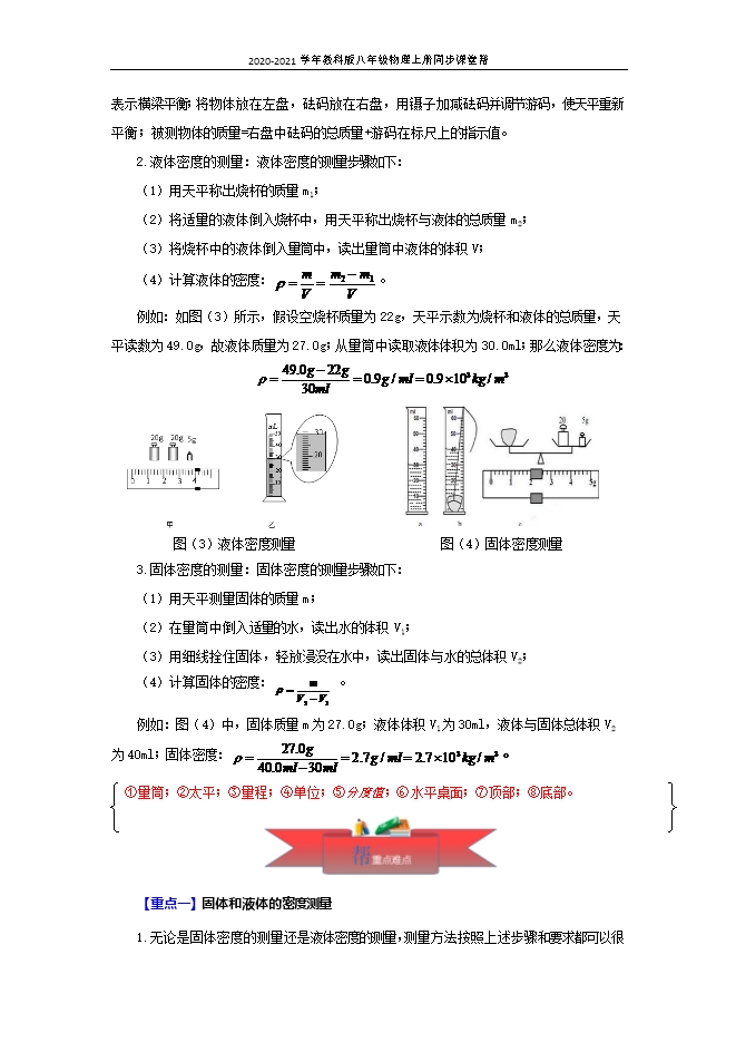 【内容简介】1.测量工具:密度测量的常用工具是量筒(量杯)、天平。用①测量固体和液体的体积;用②测量物体质量。(1)量筒的使用:如图(1)所示,使用量筒时应注意以下几个方面:一、首先分清量筒的③、④和⑤(常见量筒单位是ml,1ml=1cm3,1l=1000ml=10-3m3;图(1)中,量筒量程 100 ml,分度值 2 ml);二、量筒使用时应放在⑥上;三、当液面是凸面时,视线应与凸液面的⑦保持水平;当液面是凹面时,视线应与凹液面的⑧保持水平,图(2)中,红线表示正确读数的视线方向,此时读数为7.0ml)。 图(1) 图(2)(2)天平的使用:用天平测量物体的质量。天平的使用及注意事项:测量时,应将天平放在水平桌面上;先将游码拨回标尺左端的零刻线处(归零),再调节平衡螺母,使指针指到分度盘的中央刻度(或左右摆动幅度相等),表示横梁平衡;将物体放在左盘,砝码放在右盘,用镊子加减砝码并调节游码,使天平重新平衡;被测物体的质量=右盘中砝码的总质量+游码在标尺上的指示值。2.液体密度的测量:液体密度的测量步骤如下:(1)用天平称出烧杯的质量m1; (2)将适量的液体倒入烧杯中,用天平称出烧杯与液体的总质量m2;(3)将烧杯中的液体倒入量筒中,读出量筒中液体的体积V;(4)计算液体的密度: 。例如:如图(3)所示,假设空烧杯质量为22g,天平示数为烧杯和液体的总质量,天平读数为49.0g,故液体质量为27.0g;从量筒中读取液体体积为30.0ml;那么液体密度为: 图(3)液体密度测量 图(4)固体密度测量3.固体密度的测量:固体密度的测量步骤如下:(1)用天平测量固体的质量m;(2)在量筒中倒入适量的水,读出水的体积V1;(3)用细线拴住固体,轻放浸没在水中,读出固体与水的总体积V2;(4)计算固体的密度: 。例如:图(4)中,固体质量m为27.0g;液体体积V1为30ml,液体与固体总体积V2为40ml;固体密度: 。①量筒;②太平;③量程;④单位;⑤分度值;⑥水平桌面;⑦顶部;⑧底部。 【重点一】固体和液体的密度测量1.无论是固体密度的测量还是液体密度的测量,测量方法按照上述步骤和要求都可以很好地完成。但测量过程中的误差分析是学习密度测量的难点。2.误差分析的步骤:第一步,分析实验操作过程中是导致质量还是体积不准确;第二步,分析不准确的物理量是偏大还是偏小;第三步,由密度测量的原理 判断密度ρ是偏大还是偏小。