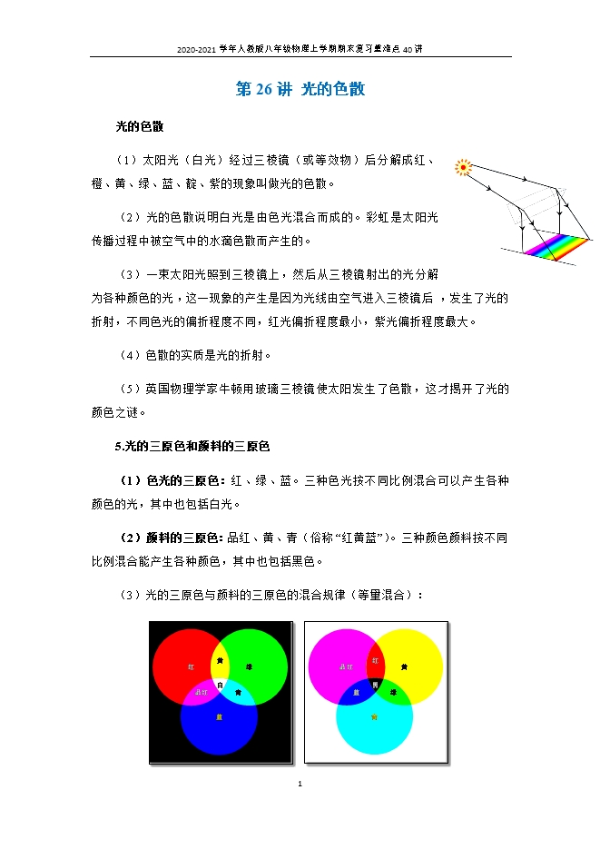 [精品]第26讲 光的色散--2020-2021学年人教版八年级物理上学期期末复习重难点40讲(解析版)