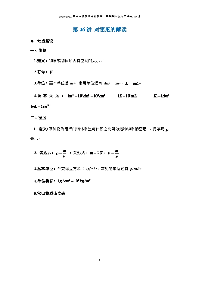 [精品]第36讲 对密度的解读--2020-2021学年人教版八年级物理上学期期末复习重难点40讲(解析版)