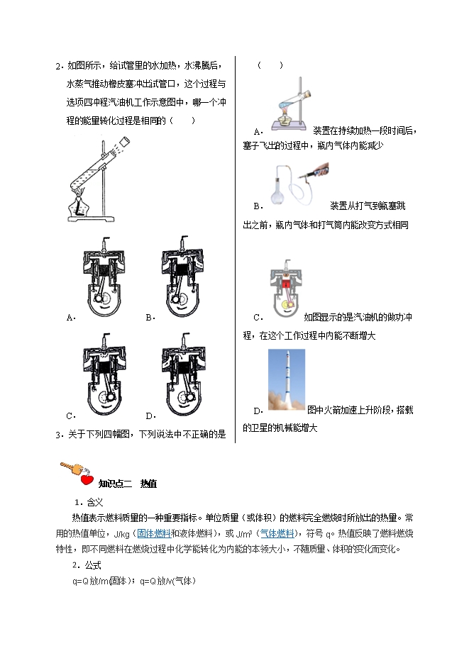 【内容简介】1.熟悉内燃机的运行过程2.掌热机效率的计算 知识点一 内燃机1.内燃机,是一种动力机械,它是通过使燃料在机器内部燃烧,并将其放出的热能直接转换为动力的热力发动机。根据燃料的不同分为汽油机和柴油机。2.四冲程:吸气冲程、压缩冲程、做功冲程、排气冲程3.汽油机与柴油机的区别 不同点汽油机柴油机构造不同气缸顶部有火花塞气缸顶部有喷油嘴燃料不同汽油柴油吸气冲程吸入的是汽油与空气的混合物只吸入空气压缩冲程气体体积被压缩为吸进体积的1/6~1/9 机械能转化为内能气体体积被压缩为吸进体积的1/6~1/22 机械能转化为内能点火方式压缩冲程末,火花塞产生电火花点燃燃料,称为点燃式压缩冲程末,喷油嘴向气缸内喷进柴油遇温度超过柴油燃点的空气而自动点燃,称为压燃式做功冲程高温高压气体推动活塞做功,气体内能减少,转化为飞轮的机械能内能转化为机械能高温高压气体推动活塞做功,气体内能减少,推动活塞向下运动,并通过连杆曲轴推动飞轮旋转内能转化为机械能效率效率低,20%~30%效率高,30%~45%应用机体较轻,主要用于汽车、飞机、摩托车等机体较重,主要用于载重汽车、火车、轮船等 【内燃机】1.针对汽油机的压缩冲程,下列说法中正确的是( )A.气缸中的工作物质压强增大,温度降低B.气缸中的工作物质压强减小,温度升高C.气缸中的工作物质内能增大,温度升高D.气缸中的工作物质内能减小,温度降低【解答】解:汽油机的压缩冲程汽缸里面的气体质量不变,汽缸里面的气体压强增大,汽缸里面的气体温度升高,所以热机工作时,压缩冲程将机械能转化为内能,故选项ABD错误。故选:C。2.如图所示,给试管里的水加热,水沸腾后,水蒸气推动橡皮塞冲出试管口,这个过程与选项四冲程汽油机工作示意图中,哪一个冲程的能量转化过程是相同的( ) A. B. C. D. 【解答】解:水沸腾后,水蒸气推动橡皮塞冲出试管口,是水蒸气的内能转化为机械能,与做功冲程中的能量转化相同;A、图中,两气门都关闭,活塞上行,汽缸容积变小,是压缩冲程,此冲程将机械能转化为内能;B、图中,排气门开启,活塞上行,气体流出汽缸,是排气冲程;C、图中,两气门都关闭,活塞下行,汽缸容积变大,是做功冲程,此冲程将内能转化为机械能;D、图中,进气门开启,活塞下行,气体流入汽缸,是吸气冲程。故C符合题意,ABD不合题意。故选:C。3.关于下列四幅图,下列说法中不正确的是( )A. 装置在持续加热一段时间后,塞子飞出的过程中,瓶内气体内能减少B. 装置从打气到瓶塞跳出之前,瓶内气体和打气筒内能改变方式相同C. 如图显示的是汽油机的做功冲程,在这个工作过程中内能不断增大D. 图中火箭加速上升阶段,搭载的卫星的机械能增大【解答】解:A、在试管内装些水,用橡胶塞塞住,加热使水沸腾,会看到塞子受到水蒸气的压力而冲出去,此过程蒸气对外做功,内能减小,温度降低,故A正确;B、用打气筒向瓶内打气的过程中压缩瓶内空气做功,机械能转化为内能;活塞克服与筒壁间的摩擦做功,机械能转化为内能,属于做功改变物体的内能,瓶内气体和打气筒内能改变方式相同,故B正确;C、汽油机的做功冲程中,燃气对活塞做功,燃气的内能转化为机械能,所以燃气的内能减少,故C错误;D、火箭加速上升的过程中,搭载的卫星的质量不变,其速度增大、高度增大,所以动能和重力势能都增大,即机械能增大,故D正确。故选:C。 知识点二 热值1.含义热值表示燃料质量的一种重要指标。单位质量(或体积)的燃料完全燃烧时所放出的热量。常用的热值单位,J/kg(固体燃料和液体燃料),或J/m3(气体燃料),符号q。热值反映了燃料燃烧特性,即不同燃料在燃烧过程中化学能转化为内能的本领大小,不随质量、体积的变化而变化。2.公式q=Q放/m(固体);q=Q放/v(气体) 【内燃机】1.关于燃料的热值,以下说法正确的( )A.燃料不完全燃烧时的热值比完全燃烧时的热值小B.0.5g汽油和2kg汽油,它们的热值是一样的C.当燃料未燃烧时,其热值为零D.煤油的热值比酒精大,就是说煤油完全燃烧放出的热量比酒精多【解答】解:AC、燃料的热值只与燃料的种类有关,与燃料的燃烧情况无关,故AC错误;B、燃料的热值只与燃料的种类有关,与燃料的质量无关,所以0.5g汽油和2kg汽油的热值是一样的,故B正确;D、煤油的热值比酒精大,意思是在质量相同时煤油完全燃烧放出的热量比酒精多,故D错误。故选:B。