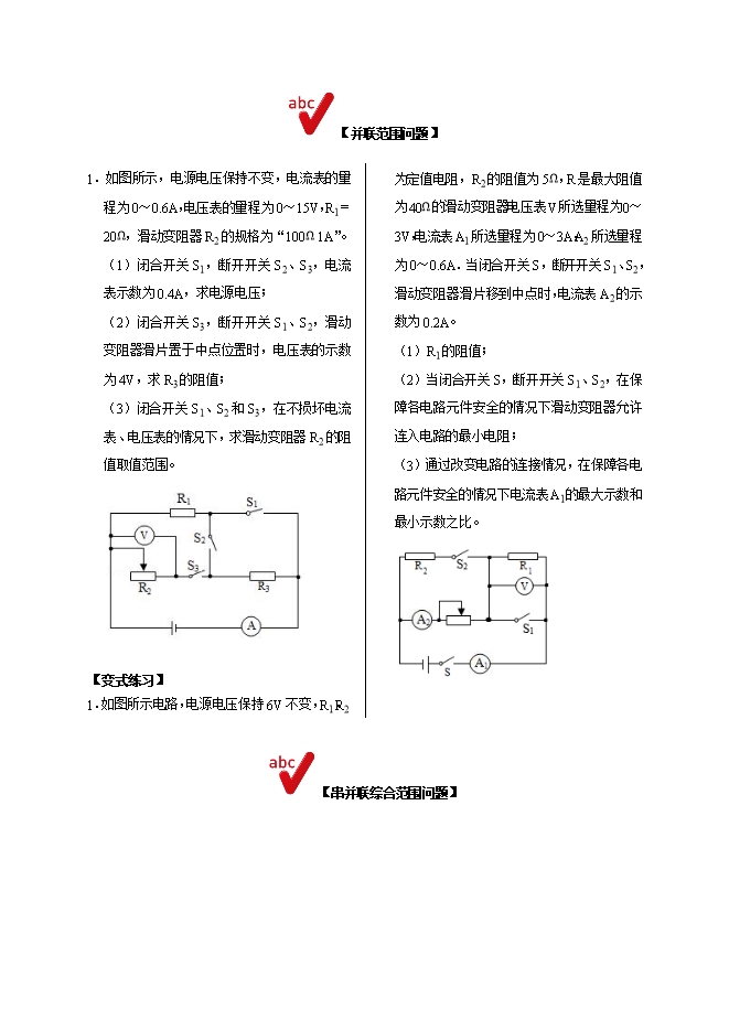 【内容简介】1.掌握串联电路求电流、电压、电阻范围的方法2.掌握并联电路求电流、电压、电阻范围的方法 【电压表测定值电阻范围问题】1.如图所示电路,已知电流表的量程为0~0.6A,电压表的量程为0~3V,定值电阻R1阻值为6Ω,滑动变阻器R2的最大阻值为24Ω,电源电压为6V,开关S闭合后,在滑动变阻器滑片滑动过程中,保证电流表、电压表不被烧坏的情况下( ) A.滑动变阻器的阻值变化范围为5Ω﹣24ΩB.电压表的示数变化范围是1.5V﹣3VC.电路中允许通过的最大电流是0.6AD.电流表的示数变化范围是0.2A﹣0.5A【解答】解:由电路图可知,R1与R2串联,电压表测R1两端的电压,电流表测电路中的电流。(1)根据欧姆定律可得,电压表的示数为3V时,电路中的电流:I= = =0.5A,由于电流表的量程为0~0.6A,则电路中的最大电流为0.5A,故C错误;此时滑动变阻器接入电路中的电阻最小,由欧姆定律可知电路中的总电阻:R= = =12Ω,根据串联电路中总电阻等于各分电阻之和可知:变阻器接入电路中的最小阻值R2最小=R﹣R1=12Ω﹣6Ω=6Ω,即滑动变阻器的阻值变化范围为6Ω~24Ω,故A错误;(2)当滑动变阻器的最大阻值和定值电阻串联时,电路中的电流最小,电压表的示数最小,此时电路中的最小电流:I′= = =0.2A,则电流表的示数变化范围是0.2A~0.5A,故D正确;电压表的最小示数:U1′=I′R1=0.2A×6Ω=1.2V,则电压表的示数变化范围是1.2V~3V,故B错误。故选:D。2.如图电路中,电源电压恒为4.5V,电压表的量程为0~3V,电流表的量程为0~0.6A.滑动变阻器的规格为“20Ω lA”,灯泡标有“2.5V 1.25W”字样,不考虑灯丝电阻的变化。若闭合开关,下列说法中正确的是( ) A.电流表示数的变化范围是0.2~0.5AB.滑动变阻器的电阻允许调节的范围是4~20ΩC.电压表示数的变化范围是1V~2.5VD.该电路的最大功率是2.5 W【解答】解:由电路图可知,滑动变阻器与灯泡串联,电压表测灯泡两端的电压,电流表测电路中的电流。(1)根据P=UI可得,灯的额定电流:IL额= = =0.5A,因为串联电路中各处的电流相等,且电流表的量程为0~0.6A,所以,电路中的最大电流为Imax=0.5A;电压表的最大电压为2.5V;由I= 得:灯泡的电阻RL= = =5Ω,电路中的总电阻R= = =9Ω,根据串联电路中总电阻等于各分电阻之和可知:滑动变阻器接入电路中的最小阻值为R滑=R﹣RL=9Ω﹣5Ω=4Ω,则滑动变阻器的电阻允许调节的范围是4~20Ω,故B正确;该电路的最大功率:Pmax=UImax=4.5V×0.5A=2.25W,故D错误;(2)当滑动变阻器接入电路中的电阻最大时,灯泡的功率最小,则总阻值为R′=RL+R滑max=5Ω+20Ω=25Ω,此时电路中的电流:Imin= = =0.18A,所以,电流表示数的变化范围是0.18~0.5A,故A错误;电压表的最小示数:UL=IminRL=0.18A×5Ω=0.9V,所以,电压表的示数变化范围0.9V~2.5V,故C错误。故选:B。3.如图所示电路,已知电流表的量程为0~0.6A,电压表的量程为0~3V,定值电阻R1阻值为10Ω,滑动变阻器R2的最大阻值为50Ω,电源电压为6V,开关S闭合后,在滑动变阻器滑片滑动过程中,保证电流表、电压表不被烧坏的情况下( ) A.滑动变阻器滑片允许滑到最左端B.电压表最小示数是1VC.电路中允许通过的最大电流是0.6AD.滑动变阻器滑片移动过程中,电流表先达到最大量程【解答】解:A、当滑片滑到最左端时,电源电压全部提供给R1,其电压为6V,超过电压表量程,故A不符合题意;B、当滑片在最右端时,电压表示数最小,R=R1+R2=10Ω+50Ω=60Ω,I= = =0.1A,U1=IR1=0.1A×10Ω=1V,故B符合题意;