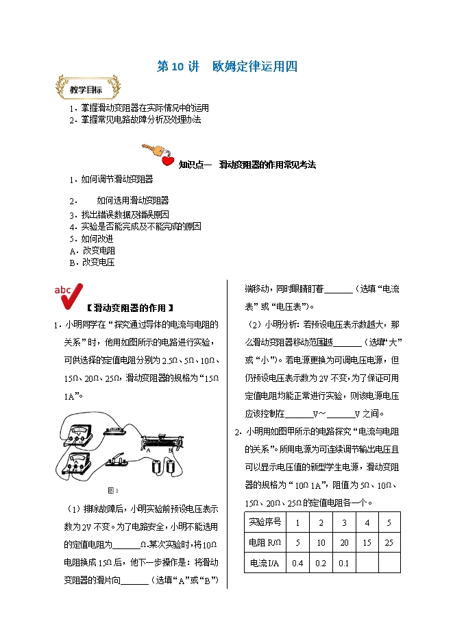 【内容简介】1.掌握滑动变阻器在实际情况中的运用2.掌握常见电路故障分析及处理办法 知识点一 滑动变阻器的作用常见考法1.如何调节滑动变阻器 2.如何选用滑动变阻器 3.找出错误数据及错误原因4.实验是否能完成及不能完成的原因5.如何改进A.改变电阻B.改变电压 【经典例题二】1.小明同学在“探究通过导体的电流与电阻的关系”时,他用如图所示的电路进行实验,可供选择的定值电阻分别为2.5Ω、5Ω、10Ω、15Ω、20Ω、25Ω,滑动变阻器的规格为“15Ω 1A”。 (1)排除故障后,小明实验前预设电压表示数为2V不变。为了电路安全,小明不能选用的定值电阻为 Ω.某次实验时,将10Ω电阻换成15Ω后,他下一步操作是:将滑动变阻器的滑片向 (选填“A”或“B”)端移动,同时眼睛盯着 (选填“电流表”或“电压表”)。(2)小明分析:若预设电压表示数越大,那么滑动变阻器移动范围越 (选填“大”或“小”)。若电源更换为可调电压电源,但仍预设电压表示数为2V不变,为了保证可用定值电阻均能正常进行实验,则该电源电压应该控制在 V~ V之间。【解答】解:(1)电流表选用小量程,电路的最大电流为0.6A;实验中电阻R两端的电压始终保持2V不变,若选用2.5Ω的电阻,由欧姆定律,电路的电流为:I= = =0.8A>0.6A,故实验中,不能被选用的电阻是2.5Ω;根据串联分压原理可知,将定值电阻由10Ω改接成15Ω的电阻,电阻增大,其分得的电压增大;探究电流与电阻的实验中应控制电压不变,即应保持电阻两端的电压不变,根据串联电路电压的规律可知应增大滑动变阻器分得的电压,由分压原理,应增大滑动变阻器连入电路中的电阻,所以滑片应向右A端移动,同时眼睛盯着电压表,使电压表的示数不变;(2)电压预设值越大,电路中电流越大,变阻器两端电压越小,由欧姆定律可知,变阻器连入阻值越小,滑动变阻器阻值调节范围越小;由题意知,滑动变阻器的最大阻值为15Ω,定值电阻的最大电阻为25Ω;根据串联电路的电压关系:由串联电路的规律及分压原理有: = 方程左边为一定值,故右边也为一定值,当变阻器连入电路的电阻最大时,对应的定值电阻应最大,此时电源电压最大, = 电源电压最大值:U电源=3.2V故为保证可用电阻均能正常进行实验,电源电压应该控制在2V至3.2V之间。2.小明用如图甲所示的电路探究“电流与电阻的关系”。所用电源为可连续调节输出电压且可以显示电压值的新型学生电源,滑动变阻器的规格为“10Ω 1A”,阻值为5Ω、10Ω、15Ω、20Ω、25Ω的定值电阻各一个。实验序号12345电阻R/Ω510201525电流I/A0.40.20.1 (1)进行第4次实验时,小明用15Ω定值电阻代替20Ω,直接读出电流表示数如图乙所示。由此可知:小明实验时电源电压是调节为 V输出的。为保证实验探究的合理性,小明应在将滑动变阻器的滑片调至第3次实验时滑片位置的 侧(左/右)。(2)继续完成第5次实验时,小明将滑动变阻器调到最大值时,依然无法达到实验要求。为完成实验,小明可以 A.将电源电压调至2.5VB.把变阻器换为“15Ω 1A”的规格再重新调节C.将电源电压调至3.8VD.把变阻器换为“5Ω 1A”的规格,再重新调节【解答】解: