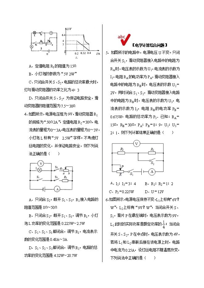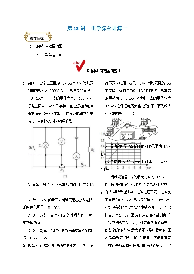 【内容简介】1.电学计算范围问题2.电学综合计算一.选择题(共7小题)1.如图,电源电压恒为9V,R1=9Ω,滑动变阻器的规格为“50Ω0.5A”,电流表的量程为“0~3A”,电压表的量程为“0~15V”,小灯泡上标有“6V?”字样,通过灯泡的电流随电压变化关系如图乙。在保证电路安全的情况下。则下列说法错误的是( ) A.由图可知,灯泡正常发光时的电阻为7.5ΩB.当S1、S2都断开,滑动变阻器接入电路的阻值范围是14Ω~50ΩC.S1、S2都闭合时,10s的时间内R1产生的热量为90JD.S1、S2都闭合时,电路消耗功率的范围是10.62W~27W【解答】解:A、灯泡正常发光时的电压UL=6V,由乙图可知灯泡正常发光时的电流IL=0.8A,由欧姆定律可得灯泡正常发光时的电阻:RL= = =7.5Ω,故A正确。B、由电路图可知,当S1、S2都断开,灯泡和滑动变阻器串联,电压表测灯泡两端的电压,电流表测电路中的电流;由题意和A的解答可知,滑动变阻器允许通过的最大电流为0.5A,灯泡正常发光时的电流为0.8A,电流表的量程为0~3A,因串联电路中电流处处相等,所以在保证电路安全的情况下,电路中的最大电流I大=0.5A,由图乙可知,此时灯泡两端的电压UL′=2V,由串联电路的电压特点可得,滑动变阻器R2两端的电压:U2=U﹣UL′=9V﹣2V=7V,则滑动变阻器接入电路中的最小阻值:R2小= = =14Ω;当滑动变阻器接入电路中的阻值最大为50Ω时,电路中的电流最小,电压表示数最小,各元件是安全的,所以,滑动变阻器接入电路的阻值范围是14Ω~50Ω,故B正确。C、当S1、S2都闭合时,灯泡被短路,R1与R2并联,由并联电路的特点可知R1两端的电压U=9V,则10s内R1产生的热量:Q1=W1= t= ×10s=90J,故C正确;D、当S1、S2都闭合时,灯泡被短路,R1与R2并联,电流表测干路中的电流;由欧姆定律可得通过定值电阻R1的电流:I1= = =1A,当滑动变阻器R2接入电路中的阻值最大时,通过变阻器的电流最小,则通过R2的最小电流:I2小= = =0.18A,由并联电路的电流特点可得最小总电流:I总小=I1+I2小=1A+0.18A=1.18A,则电路消耗的最小功率:P总小=UI总小=9V×1.18A=10.62W;滑动变阻器允许通过的最大电流为0.5A,且由并联电路的特点可知通过R1的电流为1A不变,所以,电路中的最大总电流:I总大=I1+I2大=1A+0.5A=1.5A<3A,则电路消耗的最大功率:P总大=UI总大=9V×1.5A=13.5W;所以,电路消耗功率的范围为10.62W~13.5W,故D错误。故选:D。2.如图所示电路,电源两端电压为 4.5V 且保持不变。电阻 R1为 10Ω,滑动变阻器 R2 的铭牌上标有“20Ω,1A”的字样,电流表的量程为 0~0.6A,两块电压表的量程均为 0~3V,在保证电路安全的条件下,下列说法中正确的是( ) A.滑动变阻器 R2 的阻值取值范围为 5Ω~15ΩB.电流表 A 的示数变化范围为 0.15A~0.45AC.滑动变阻器 R2的最大功率为 0.45WD.总功率的变化范围为 0.675W~1.35W【解答】解:由电路图可知,R1与R2串联,电压表V1测R1两端的电压,电压表V2测R2两端的电压,电流表测电路中的电流。(1)当电压表V1的示数U1max=3V时,电路中的电流最大,变阻器接入电路中的电阻最小,R1的功率最大,串联电路中各处的电流相等,所以电路中的最大电流:Imax= = =0.3A,串联电路中总电压等于各分电压之和,所以R2两端的最小电压:U2min=U﹣U1max=4.5V﹣3V=1.5V,此时变阻器连入电路的阻值最小值:R2min= = =5Ω,电路消耗的最大电功率:Pmax=UImax=4.5V×0.3A=1.35W;(2)当滑动变阻器接入电路中的电阻最大时,电路中的电流最小,即Imin= = =0.15A,此时电压表V2的示数:U2=IminR2=0.15A×20Ω=3V,不超过量程;电路消耗的最小电功率:Pmin=UImin=4.5V×0.15A=0.675W;所以电流表A的示数范围为0.15A~0.3A,故B不正确;滑动变阻器R2的阻值取值范围为5Ω~20Ω,故A不正确;总功率的变化范围为 0.675W~1.35W,故D正确;(3)由欧姆定律以及电功率公式可得变阻器的功率: