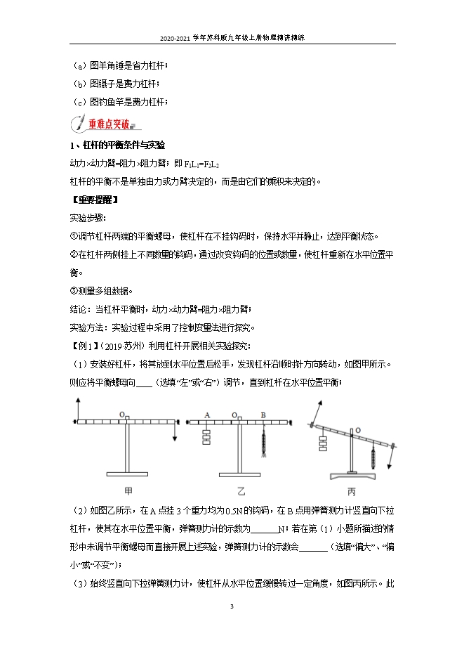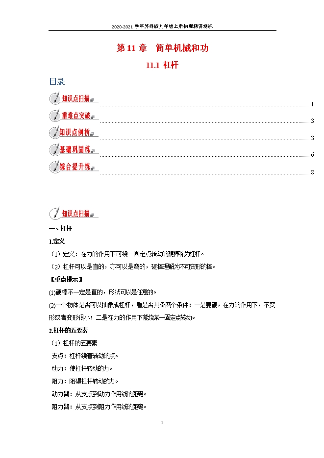 11.1 杠杆--2020-2021学年苏科版九年级上册物理精讲精练(原卷版和解析版)
