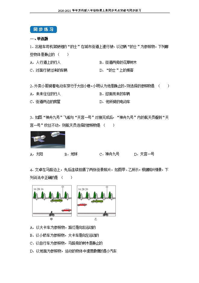 - 156【寒假作业】巩固练15 运动的相对性--2020-2021学年苏科版八年级物理上学期寒假作业
