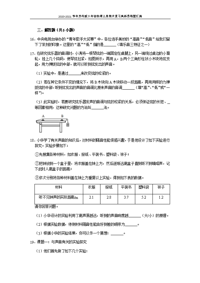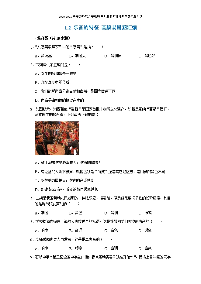 【内容简介】1.“女高音歌唱家”中的“高音”是指( )A.音调高B.响度大C.音调低D.音色好解:此题中“女高音歌唱家”中的“高音”是指声音的尖锐程度,即声音的高低,故指的是音调;故选:A。总结:声音的特征有音调、响度、音色;三个特征是从三个不同角度描述声音的,且影响三个特征的因素各不相同。2.下列说法不正确的是( )A.女生的音调都是一样的B.光在真空中能传播C.我们能凭声音分辨吉他和古筝,是因为音色不同D.声音是由物体的振动产生的解:A、女生的音调不一定都一样;有的音调高,有的音调低;故A的说法不正确;B、光能够在真空中传播,传播速度为:3×108m/s;故B的说法正确;C、能凭声音分辨吉他和古筝,是因为他们的音色不同;故C的说法正确;C、物体的振动产生声音;故声音是由物体的振动产生;故D的说法正确;故选:A。总结:此题考查声的综合知识和光的传播;明确声音的产生、区分声音的三个特征、光的传播;可解答此题。3.如图所示,湘西苗族“鼓舞”是国家首批非物质文化遗产,该舞是围绕“苗鼓”展开,从物理学的知识看,下列说法正确的是( ) A.鼓手敲击鼓的频率越大,鼓声响度越大B.有经验的人听下鼓声,就能区别是“苗鼓”还是其它地区鼓,是因鼓的音色不同C.敲鼓的力量越大,鼓声的音调越高D.距离鼓面越远,听到的鼓声频率越低解:A、鼓手敲击鼓的频率越大,鼓声的音调越高,而不是响度越大,故A错误;B、人们根据音色来辨别不同乐器发出的声音,所以有经验的人听下鼓声,就能区别是“苗鼓”还是其它地区鼓,故B正确;C、敲鼓的力量越大,振幅越大,响度越大,故C错误;D、距离鼓面越远,听到的鼓声响度越小,故D错误。故选:B。总结:本题考查了声音的相关知识,属于基础知识的考查,具有一定的综合性,属于易错题。4.二胡是我国劳动人民发明的一种弦乐器。演奏前,演员经常要调节弦的松紧程度,其目的是调节弦发声时的( )A.响度B.音色C.音调D.振幅解:(1)演员经常调节弦的松紧,弦的松紧程度决定着振动的频率,频率决定声音的音调。(2)用力大小能改变弦偏离原位置的大小,能改变振幅,能改变响度。(3)音色的影响因素是材料和结构,改变松紧时,没有改变弦的材料和结构,没有改变音色。故选:C。总结:(1)掌握声音的三个特性,三个特性的影响因素。(2)音调和响度容易混淆,注意区分。