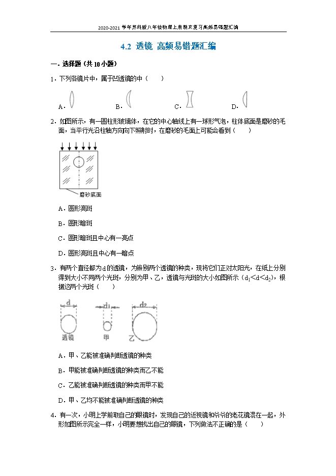2020-2021学年苏科版八年级物理上册期末复习高频易错题汇编:4.2 透镜(原卷版和解析版)