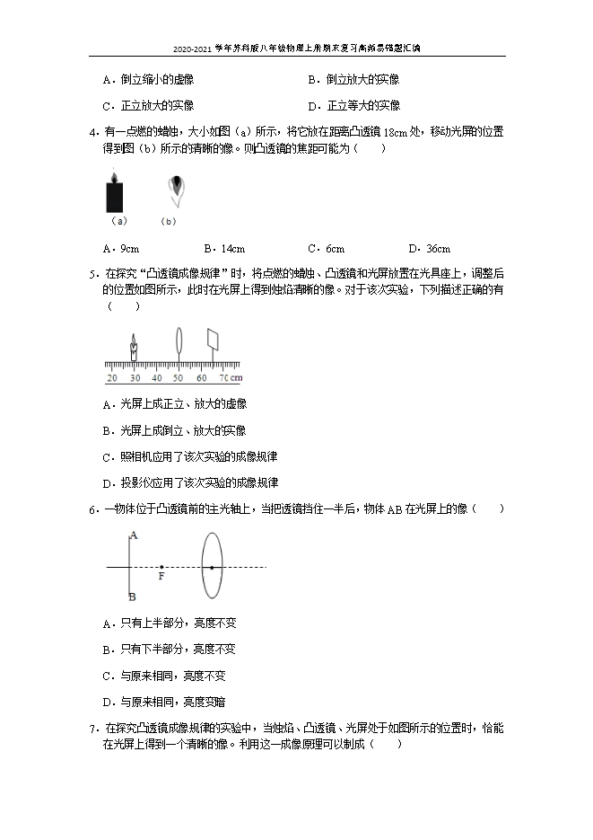 【内容简介】1.如图所示,某兴趣小组利用透明橡皮膜、注射器、乳胶管、止水夹等器材制成凸透镜,并利用液体透镜探究“凸透镜成像规律”。下列分析不正确的是( ) A.按照图甲测出水凸透镜的焦距,如果将该水透镜放在图乙所示位置,光屏上恰能成倒立、放大的实像B.若在图乙中蜡烛和透镜间放一近视眼镜,要再次成清晰的像,需将光屏向左移动C.若保持图乙中透镜位置不变,将蜡烛向右移动3cm,要在光屏上得到清晰的像,光屏向右移动的距离应大于3cmD.如图甲所示,在透镜中继续注入少许水,发现焦点位置左移,这一现象说明:凸透镜的凸出程度越大,焦距越小解:A、由图甲可知凸透镜的焦距为52.0cm﹣40.0cm=12.0cm;由图乙可知,物距u=30cm﹣10cm=20cm,物距在一倍焦距和二倍焦距之间,成倒立、放大的实像,故A正确;B、把近视眼镜放在蜡烛和凸透镜之间,由于近视眼镜是凹透镜,对光线有发散作用,所以通过凸透镜的光线比以前会聚得要晚了,像距更大了,因此要得到清晰的像,需将光屏远离凸透镜,即将光屏向右移动,故B错误;C、凸透镜成倒立、放大的实像,像距大于物距,将蜡烛向右移动3cm,物距减小,像距变大,像变大,故光屏应向右移动,且移动距离大于3cm,故C正确;D、在透镜中继续注入少许水,焦点左移,即焦距减小,说明水透镜的凸出程度越大,焦距越小,故D正确。故选:B。总结:本题首先确定凸透镜的焦距,然后根据凸透镜成像的几种情况进行判断,要熟练掌握成像特点与物距、像距之间的关系及其应用。2.小燕同学在做“研究凸透镜成像规律”实验时,将点燃的蜡烛、凸透镜、光屏调试到如图所示的位置,光屏中心正好出现清晰的像(未画出)。下列说法中正确的是( ) A.凸透镜焦距为20cmB.屏上的像是倒立、缩小的实像C.焟烛燃烧变短,屏上像的位置会下降D.取走光屏,则凸透镜不成像解:A、根据图示信息可知,物距大于像距,成倒立缩小实像,此时u>2f,即40cm>2f,焦距大小为f<20cm,故A错误;B、能在光屏上成像,并且物距大于像距,只有u>2f,2f>v>f,成倒立缩小实像,故B正确;C、因为经过光心的光线方向不发生改变,则蜡烛变短时,像应该先上移动,故C错误;D、凸透镜成像与有无光屏无关,所以取走光屏,则凸透镜仍能成像,故D错误。故选:B。总结:在凸透镜成像实验中,注意物距条件的应用和把握,熟知成像规律是解题关键。3.物体放在凸透镜前某一位置时,在透镜的另一侧离透镜10cm的光屏上成倒立缩小的像,当物体移至凸透镜前10cm处时,所成的像是( )A.倒立缩小的虚像B.倒立放大的实像C.正立放大的实像D.正立等大的实像解:蜡烛位于凸透镜前,调节好透镜和光屏位置后,在透镜另一侧离透镜10cm的光屏上呈现缩小、倒立的像,说明此时u>2f,2f>v>f。把蜡烛移到距透镜10cm处时,2f>u>f,v>2f,相当于像与物的位置对调,光屏上呈现倒立、放大的实像。故选:B。总结:本题实际上是将物与像的位置对调了,也可以用光折射时光路是可逆的来解。这要求学生能熟练掌握凸透镜成像的规律才行。