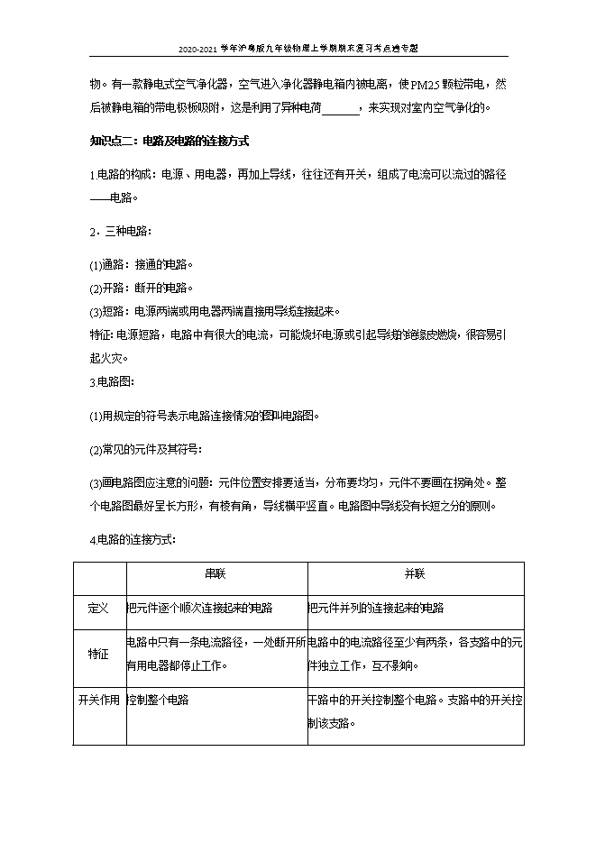 【内容简介】知识点一:两种电荷1.电荷:物体有了吸引轻小物体的性质,我们说物体带了电,或带了电荷。2.摩擦起电:用摩擦的方法使物体带电,叫做摩擦起电。 3.正电荷:丝绸摩擦过的玻璃棒带的电荷叫正电荷。4.负电荷:毛皮摩擦过的橡胶棒上带的电荷叫负电荷。5.电荷作用规律:同种电荷互相排斥,异种电荷互相吸引。 6.验电器:(1)验电器的结构:金属球、金属杆、金属箔。(2)作用:检验物体是否带电。(3)原理:同种电荷互相排斥。(4)检验物体是否带电的方法:看是否可以吸引轻小物体;通过验电器;利用电荷间的相互作用。典例1.(2020绵阳模拟)甲、乙、丙三个轻质小球,已知甲带正电,甲与乙间相互排斥,甲与丙间相互吸引。则 ( )A.乙带正电,丙一定带正电B.乙带正电,丙可能不带电C.乙带负电,丙一定带负电D.乙带负电,丙可能带负电【答案】B甲带正电,甲与乙间相互排斥,说明甲、乙都带正电;甲与丙间相互吸引,因为吸引的情况有两种可能,即两球可能都带电且是异种电荷,也可能一个带电,另一个不带电;故丙可能带负电,也可能不带电。故ACD不符合题意,B符合题意。故选B。典例2.(2020福州模拟)如图所示的“吸引现象”由静电引起的是( ) 【答案】C【解析】A.磁铁吸引硬币是由于磁体有吸引铁、钴、镍的性质,故A不符合题意;B.压紧的铅块互相吸引,是由于分子之间有引力,故B不符合题意;C.摩擦后的气球吸引头发,是因为气球摩擦后带上静电,吸引轻小物体,故C符合题意;D.吸盘吸在墙壁上是大气压的作用,故D不符合题意。故选C。典例3.(2020西安模拟)PM2.5颗粒是指大气中直径小于或等于2.5_______(填单位)的颗粒物。有一款静电式空气净化器,空气进入净化器静电箱内被电离,使PM2.5颗粒带电,然后被静电箱的带电极板吸附,这是利用了异种电荷_______,来实现对室内空气净化的。【答案】微米(或μm);相互吸引(或吸引)【解析】PM2.5颗粒直径小于或等于2.5 μm;PM2.5颗粒带电,被带电极板吸附,说明两个带电体带的是异种电荷,利用了异种电荷相互吸引达到净化空气的目的。知识点二:电路及电路的连接方式1.电路的构成:电源、用电器,再加上导线,往往还有开关,组成了电流可以流过的路径——电路。2.三种电路:(1)通路:接通的电路。(2)开路:断开的电路。(3)短路:电源两端或用电器两端直接用导线连接起来。特征:电源短路,电路中有很大的电流,可能烧坏电源或引起导线的绝缘皮燃烧,很容易引起火灾。3.电路图:(1)用规定的符号表示电路连接情况的图叫电路图。(2)常见的元件及其符号:(3)画电路图应注意的问题:元件位置安排要适当,分布要均匀,元件不要画在拐角处。整个电路图最好呈长方形,有棱有角,导线横平竖直。电路图中导线没有长短之分的原则。4.电路的连接方式: