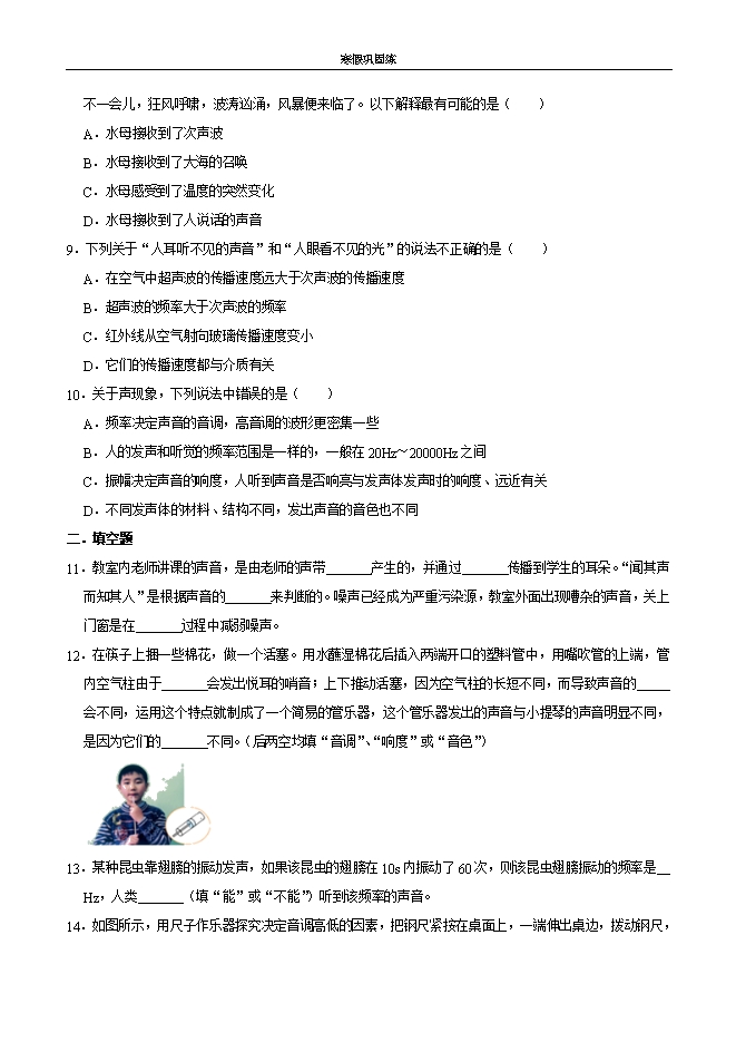 - 11922022-2023学年度沪科版八年级物理培优练习:第3章 声的世界(附答案)