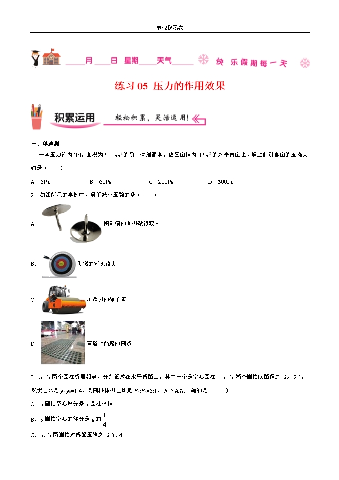【内容简介】1.一本重力约为3N,面积为500cm2的初中物理课本,放在面积为0.5m2的水平桌面上,静止时对桌面的压强大约是( )A.6Pa B.60Pa C.200Pa D.600Pa【答案】B【解析】物理课本对桌面的压力 物理课本对桌面的压强 。故B符合题意,ACD不符合题意。故选B。2.如图所示的事例中,属于减小压强的是( )A. 图钉帽的面积做得较大B. 飞镖的箭头很尖C. 压路机的碾子重D. 盲道上凸起的圆点【答案】A【解析】A.图钉帽的面积做得较大,是在压力一定时,通过增大受力面积来减小压强;故A符合题意;B.飞镖的箭头很尖,是在压力一定时,通过减小受力面积来增大压强;故B不符合题意;C.压路机的碾子重,是在受力面积一定时,通过增大压力来增大压强。故C不符合题意;D.盲道上凸起的圆点,是在压力一定时,通过减小受力面积来增大压强;故D不符合题意。故选A。3.a、b两个圆柱质量相等,分别正放在水平桌面上,其中一个是空心圆柱。a、b两个圆柱底面积之比为2:1,密度之比是ρa:ρb=1:4,两圆柱体积之比是Va:Vb=6:1,以下说法正确的是( )A.a圆柱空心部分是b圆柱体积B.b圆柱空心的部分是a的 C.a、b两圆柱对桌面压强之比3∶4D.a、b两圆柱对桌面压强之比1∶2【答案】D【解析】AB.由题意可知,两个圆柱质量相等,则 ,密度之比是ρa:ρb=1:4,根据 可知 这是两个圆柱的真实体积之比,而两圆柱体积之比是Va:Vb=6:1,从数据中可看到 ,那么其中一个是空心圆柱是a;a圆柱空心部分是 即a圆柱空心部分是b圆柱体积的两倍;A、B错误;CD.a、b两圆柱对桌面压力之比是 它们的底面积之比是 那么根据压强公式 可知,a、b两圆柱对桌面压强之比 a、b两圆柱对桌面压强之比是1:2;C错误、D正确。故选D。4.一密度为ρ的铁制零件,由粗细不同的两部分圆柱体构成,粗、细圆柱体的高度均为h,如图甲所示放置时,整体对水平面的压强为1.25ρgh,则如图乙所示放置时,整体对水平面的压强为( )