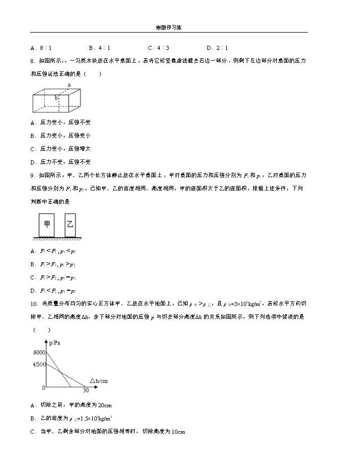 【寒假作业】预习练05 压力的作用效果--2020-2021学年沪科版八年级物理上学期寒假作业