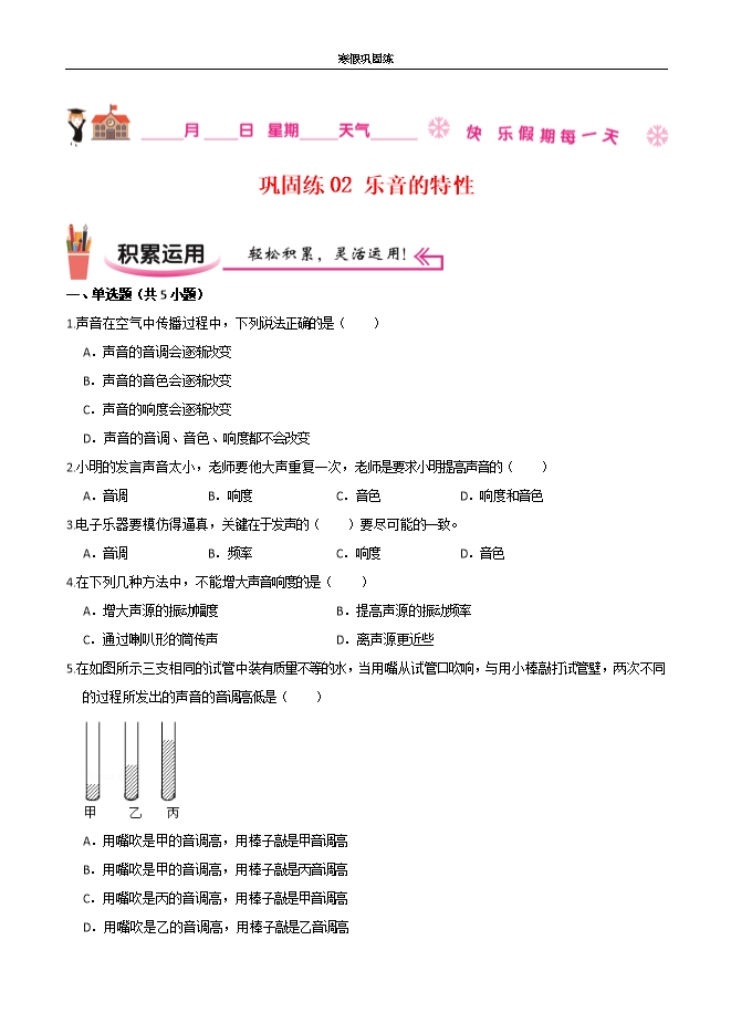 【寒假作业】巩固练02 乐音的特性--2020-2021学年苏科版八年级物理上学期寒假作业