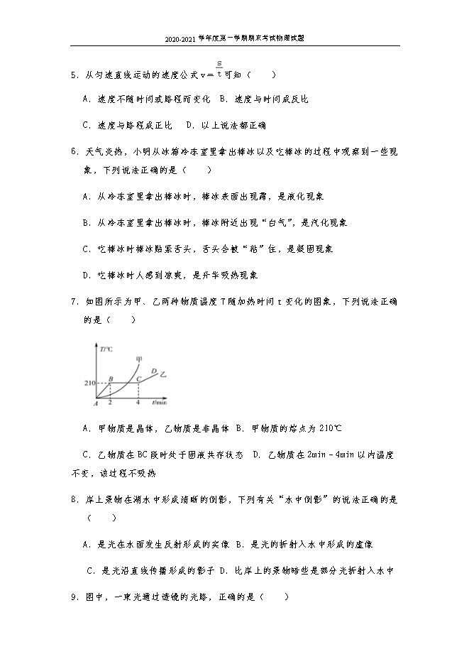 【内容简介】1.如图四种现象中,属于光的折射现象的是( )A.屏幕上的手影B.瓶子在平面镜中的像C.插入水中的铅笔好像弯折了D.水中山的倒影2.下列有关声现象的说法中,正确的是( )A.“震耳欲聋”说明声音音调高B.“隔墙有耳”可以说明真空能够传播声音C.“不在公共场所大声喧哗”是要求人们说话响度要低D.用超声波除去人体内的结石,说明声波能传递信息3.下列技术的应用中,属于利用声波传递能量的是( )A.利用鸣枪声警告歹徒B.利用超声波排除人体内的结石C.利用超声诊断仪检查人体内脏器官D.利用超声导盲仪探测前进道路上的障碍物4.甲、乙两个做匀速直线运动的物体,其运动的时间之比为5:4,经过的路程之比为7:4,则甲、乙两物体的速度之比为( )A.5:7B.7:5C.35:16D.16:355.从匀速直线运动的速度公式v= 可知( )A.速度不随时间或路程而变化B.速度与时间成反比C.速度与路程成正比D.以上说法都正确6.天气炎热,小明从冰箱冷冻室里拿出棒冰以及吃棒冰的过程中观察到一些现象,下列说法正确的是( )A.从冷冻室里拿出棒冰时,棒冰表面出现霜,是液化现象B.从冷冻室里拿出棒冰时,棒冰附近出现“白气”,是汽化现象C.吃棒冰时棒冰贴紧舌头,舌头会被“粘”住,是凝固现象D.吃棒冰时人感到凉爽,是升华吸热现象7.如图所示为甲、乙两种物质温度T随加热时间t变化的图象,下列说法正确的是( ) A.甲物质是晶体,乙物质是非晶体B.甲物质的熔点为210℃C.乙物质在BC段时处于固液共存状态D.乙物质在2min﹣4min以内温度不变,该过程不吸热8.岸上景物在湖水中形成清晰的倒影,下列有关“水中倒影”的说法正确的是( )A.是光在水面发生反射形成的实像B.是光的折射入水中形成的虚像C.是光沿直线传播形成的影子D.比岸上的景物暗些是部分光折射入水中9.图中,一束光通过透镜的光路,正确的是( )A. B. C. D. 10.把凸透镜正对着太阳,可在距凸透镜15cm处得到一个最小、最亮的光斑。若将某物体放在此凸透镜前20cm处,在凸透镜的另外一侧,调节光屏位置,可得到一个( )A.倒立、放大的实像B.倒立、缩小的实像C.正立、放大的实像D.正立、放大的虚像11.有两种密度不同的液体,取等质量或等体积混合后密度分别为ρA和ρB,则下列说法正确的是( )A.ρA大于ρBB.ρA小于ρBC.ρA等于ρBD.ρA和ρB大小无法判断12.用密度不同的两种液体装满两个完全相同的烧杯甲和乙。甲杯中两液体的质量各占一半,乙杯中两液体体积各占一半。两种液体的密度分别为ρ1和ρ2,且ρ1<ρ2.设两种液体之间不发生混合现象,若甲乙两杯内液体的质量分别为m甲和m乙,则( )A.m甲<m乙B.m甲=m乙C.m甲>m乙D.无法判断