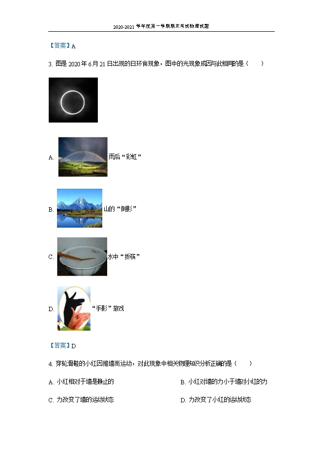 【内容简介】一、单项选择题(本大题共10小题,每小题3分,共30分)每小题给出的四个选项中,只有一个最符合题意,请将你选择的答案涂在答题卡相应的位置。1. 单位换算是学习物理重要的基本功之一、下列单位换算过程正确的是( )A. B. C. D. 【答案】D2. 小明在班里举办的小型音乐会上,用“水瓶琴”演奏了乐曲。如图所示,在8个相同的玻璃瓶中装入不同高度的水,用小木棍敲打其中两个发出的声音可能具有的相同的( ) A. 响度 音色B. 音调 音色C. 音调 响度D. 音调 响度 音色【答案】A3. 图是2020年6月21日出现的日环食现象,图中的光现象成因与此相同的是( ) A. 雨后“彩虹”B. 山的“倒影”C. 水中“折筷”D. “手影”游戏【答案】D4. 穿轮滑鞋的小红因推墙而运动,对此现象中相关物理知识分析正确的是( )A. 小红相对于墙是静止的B. 小红对墙的力小于墙对小红的力C. 力改变了墙的运动状态D. 力改变了小红的运动状态【答案】D5. 冬季到来,小明严格执行防护疫情的要求,在路上也注意佩戴口罩。一个大风降温的早上,他从家走到学校,进入教室摘下口罩后发现口罩内壁上有很多水珠,主要是因为( )A. 空气中的水蒸气液化形成B. 人呼出的气体中的水蒸气液化形成C. 空气中的露水凝结而成D. 人的唾液喷在口罩上【答案】B6. 测量是物理实验的基本技能。图中测量工具的使用,操作方法正确的是( )A. 天平测量物体 质量