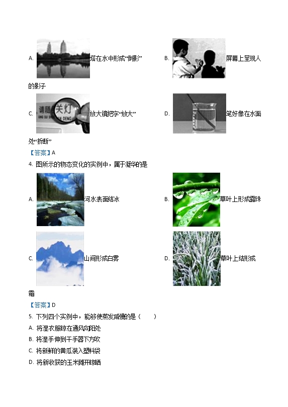【内容简介】一、单项选择题(下列各小题均有四个选项,其中只有一个选项符合题意.共34分,每小题两分)1. 如图所示的四位科学家中,以其名字命名电流单位的是( )A. 伏特 B. 焦耳C. 安培 D. 欧姆【答案】C2. 如图所示的四种物品中,通常情况下属于导体的是A. 橡胶棒 B. 塑料梳子C. 钢制饭勺 D. 木制筷子【答案】C3. 如图所示的光现象中,由于光的反射形成的是A. 塔在水中形成“倒影” B. 屏幕上呈现人的影子C. 放大镜把字“放大” D. 笔好像在水面处“折断”【答案】A4. 图所示的物态变化的实例中,属于凝华的是A. 河水表面结冰B. 草叶上形成露珠C. 山间形成白雾D. 草叶上结形成霜【答案】D5. 下列四个实例中,能够使蒸发减慢的是( )A. 将湿衣服晾在通风向阳处B. 将湿手伸到干手器下方吹C. 将新鲜的黄瓜装入塑料袋D. 将新收获的玉米摊开晾晒【答案】C6. 下列的家用电器中,利用电流热效应工作的是( )A. 电饭锅B. 笔记本电脑C. 电风扇D. 电视机【答案】A7. 关于电流、电压和电阻,忽略温度对电阻的影响,下列说法正确的是( )A. 只有自由电子定向移动才能形成电流B. 导体两端有电压,导体中就一定有电流通过C. 加在导体两端的电压,是由通过导体的电流决定D. 导体电阻大小与导体的材料、长度、横截面积有关【答案】D