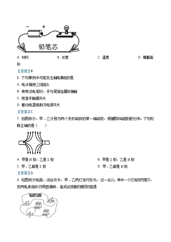 【内容简介】一、单项选择(本大题共10题,每小题3分,共30分。每小题给出的四个选项中,只有一项最符合题意)1. 如图所示的各种改变物体内能的方法中属于热传递的是( )A. 钻木取火B. 冬天搓手取暖C. 酒精灯给水加热,水的温度升高D. 向下压动活塞,硝化棉点燃【答案】C2. 如图所示的电路中,电阻阻值R1<R2.闭合开关S后,电阻R1、R2两端的电压分别为U1、U2,通过两个电阻的电流分别为I1、I2.下列判断中正确的是( ) A. I1=I2B. I1>I2C. U1=U2D. U1>U2【答案】A3. 为了节电,人们设计出一种由声控开关和光控开关共同控制楼道灯的电路,要求只有当这两个开关都闭合(即夜晚有人经过且发离)时,灯才亮。图中符合要求的电路是( )A. B. C. D. 【答案】A4. 如图,用带电棒接触原来不带电的验电器的金属球,发现验电器的金属箔张开,下列判断正确的是( ) A. 带电棒一定带正电B. 带电棒一定带负电C. 两片金属箔一定带异种电荷D. 两片金属箔一定带同种电荷【答案】D5. 如图所示,将一根铅笔芯通过两个夹子接入电路中,当只把右端夹子向左移时,铅笔芯接入电路的电阻变小,小灯泡变亮,导致铅笔芯接入电路的电阻变小的主要因素是 A. 材料B. 长度C. 温度D. 横截面积【答案】B6. 下列事例中可能发生触电事故的是A. 电冰箱用三线插头B. 使用试电笔时,手与尾部金属体接触C. 用湿手触摸开关D. 搬动电器前断开电源开关【答案】C7. 如图所示,甲、乙分别为两个条形磁铁的某一端磁极,根据图中磁感线的分布,下列判断正确的是( ) A. 甲是N极,乙是S极B. 甲是S极,乙是N极