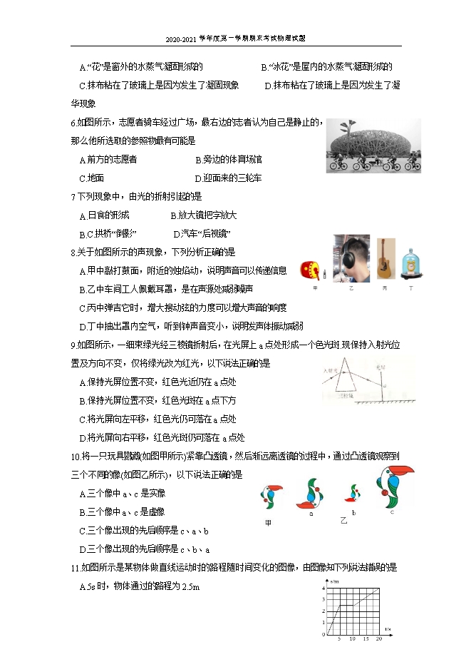 【内容简介】1.下列关于声音的说法中正确的是A.“低声轻语”主要说明了声音的音调低 B.“尖声尖叫”主要说明了声音的音调高C.“震耳欲聋”主要说明了声音的音调高 D.“闻其声而知其人”主要是根据音调来判断的2.下列几种估测最符合实际情况的是A人步行的速度约为1.4 m/min B.正常人的脉搏为70HzC.课桌的高度约为75dm D.全新的2B铅笔长约18cm3.有些物理量的大小不易直接观测,但它变化时引起其它量的变化却容易直接观测,用易观测的量显示不易观测的量是研究物理问题的一种方法,例如:发声音叉的振动可以通过激起水花来体现.以下实例中采用的研究方法与上述方法相同的是A.研究光现象时,引入光线用来描述光的传播路径和方向B.研究熔化现象时,比较冰、蜂蜡的熔化特点C.液体温度计利用液柱长度的变化来显示温度高低D.研究平面镜成像时,为了比较像与物体的大小,选用两支相同的蜡烛4.秋季的一个周末,地处江南地区的阳天气又闷又热,小明听天气预报说北方有一股弱冷空气南下,江南地区将会有一场小雨,气象台这样说的理由是A.江南地区的暖湿气流中有大量的水蒸气,水蒸气遇到冷空气迅速液化,形成降雨B.冷空气中有大量的水蒸气,遇到江南地区的暖湿气流,迅速液化,形成降雨C.冷空气把北方的水森气带到了江南地区D.江南地区的这场小与冷空气的到来无关5.北方塞冷的冬天,居民楼的玻璃上会结“冰花”,当拿起湿抹布去擦时,抹布却粘在了玻璃上,以下对上述现象的分析正确的是A.“花”是窗外的水蒸气凝固形成的 B.“冰花”是屋内的水蒸气凝固形成的C.抹布粘在了玻璃上是因为发生了凝固现象 D.抹布粘在了玻璃上是因为发生了凝华现象 6.如图所示,志愿者骑车经过广场,最右边的志者认为自己是静止的,那么他所选取的参照物最有可能是A.前方的志愿者 B.旁边的体育场馆C.地面 D.迎面来的三轮车7下列现象中,由光的折射引起的是A.日食的形成 B.放大镜把字放大 B.C.拱桥“倒影” D.汽车“后视镜”8.关于如图所示的声现象,下列分析正确的是A.甲中敲打鼓面,附近的烛焰动,说明声音可以传递信息B.乙中车间工人佩戴耳罩,是在声源处减弱噪声C.丙中弹吉它时,增大搜动弦的力度可以增大声音的响度D.丁中抽出罩内空气,听到钟声音变小,说明发声体振动减弱9.如图所示,一细束绿光经三棱镜折射后,在光屏上a点处形成一个色光斑.现保持入射光位置及方向不变,仅将绿光改为红光,以下说法正确的是A.保持光屏位置不变,红色光近仍在a点处B.保持光屏位置不变,红色光斑在a点下方C.将光屏向左平移,红色光仍可落在a点处 D.将光屏向右平移,红色光斑仍可落在a点处